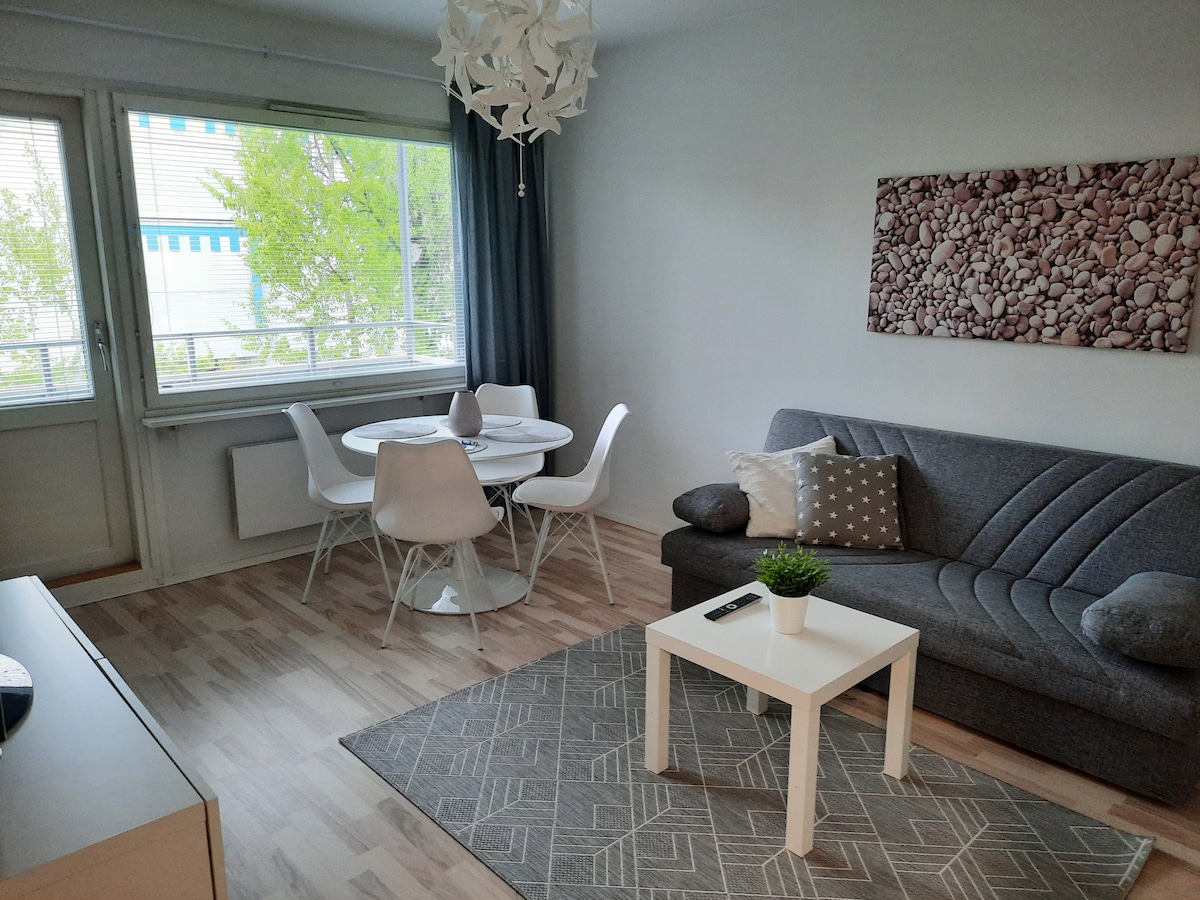 Tämä jäähdyttävällä ilmastoinnilla ja saunalla varustettu viihtyisä asunto sijaitsee keskussairaalan ja AMK:n kampusten lähellä. Autopaikka. Sisäänkirjautuminen tapahtuu avainboxin ansiosta vaivattomasti. Vuoteet kahdelle makuuhuoneessa ovat valmiiksi pedattuja ja vuodesohvasta saa lisävuoteen kolmannelle. Keittiön kaapeista löytyy kahvia, teetä, mausteita ym. jotka ovat vieraitamme varten. Kesäisin voit nauttia kahvin omalta terassilta!