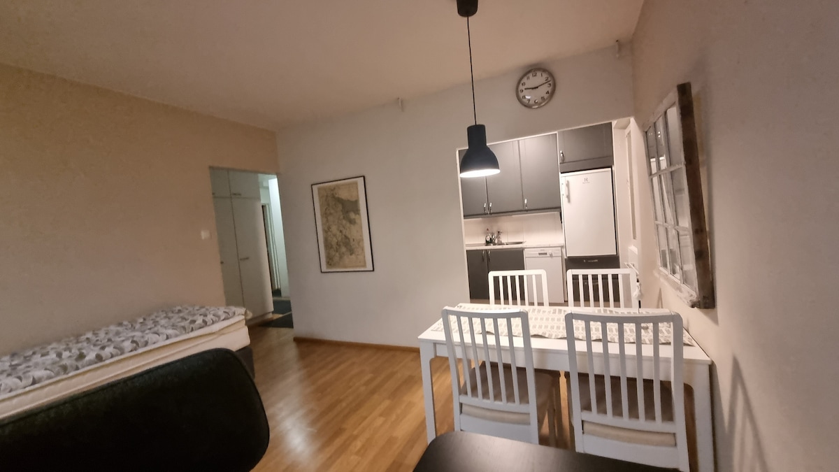 A cozy, 35,5 square meter studio apartment located in the city centre of Joensuu. The studio is in the second floor of a peaceful apartment building. There's a parking spot and an elevator. Bedlinen, towels, soap and shampoo, hair dryer, drying washing machine, kitchenware, dishwasher, refrigerator, microwave, oven and stove, coffee machine, kettle, toaster, a 43-inch smart-tv and WI-FI are included. For toddlers there's a travel crib and toys.