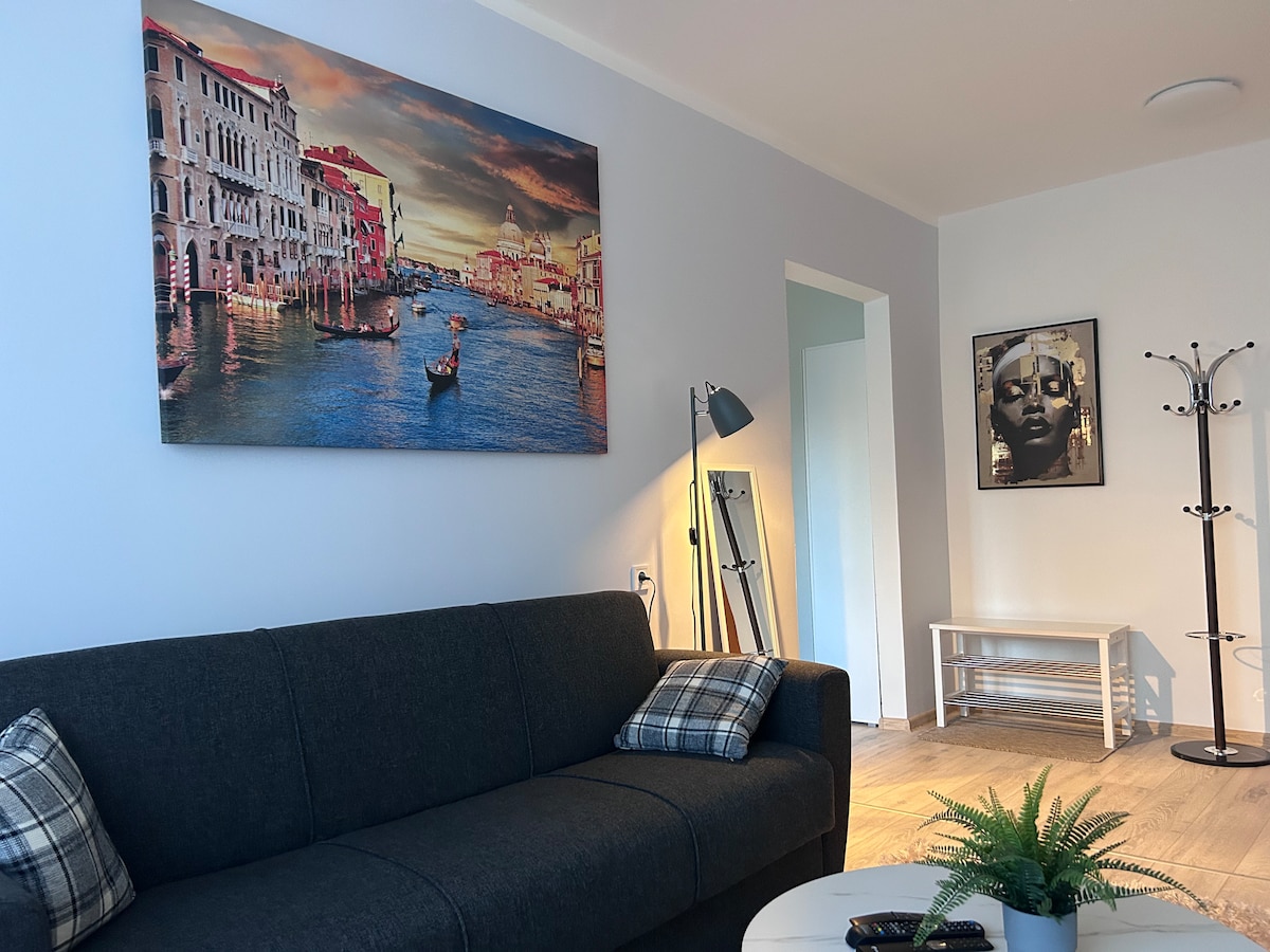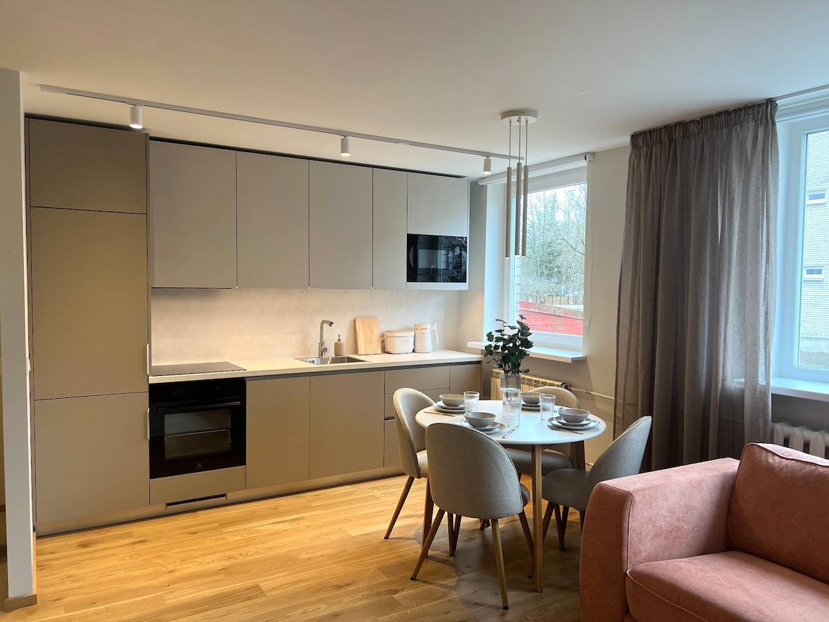 The apartment is part of an 8plex building with a Kuremaa Lake view. It has a big terrace, sauna pod and garden house. A Spacy living room accomodates up to 4 people with a kingsize bed and a comfy sofabed. Living room has a 42" TV with 60+ channels and variety of movies included. The kitchen has oven, stove, dishwasher, microwave oven, water kettle, filter coffee machine. It also has pots, pans and basic cutlery. Apartment is automatically warm through floor heating.