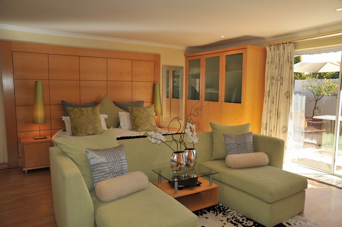 Charming farm house decor in whites and greens. Revamped modern bathroom with shower. Queen size bed plus three quarter bed for extra guest/children. Private garden patio area with table and chairs. Breakfast on request from 7 to 9am. Fiber wifi. Small well trained dogs with their own beds welcome. There is ample parking, security and a swimming pool available. The room is serviced weekly or at your convenience.