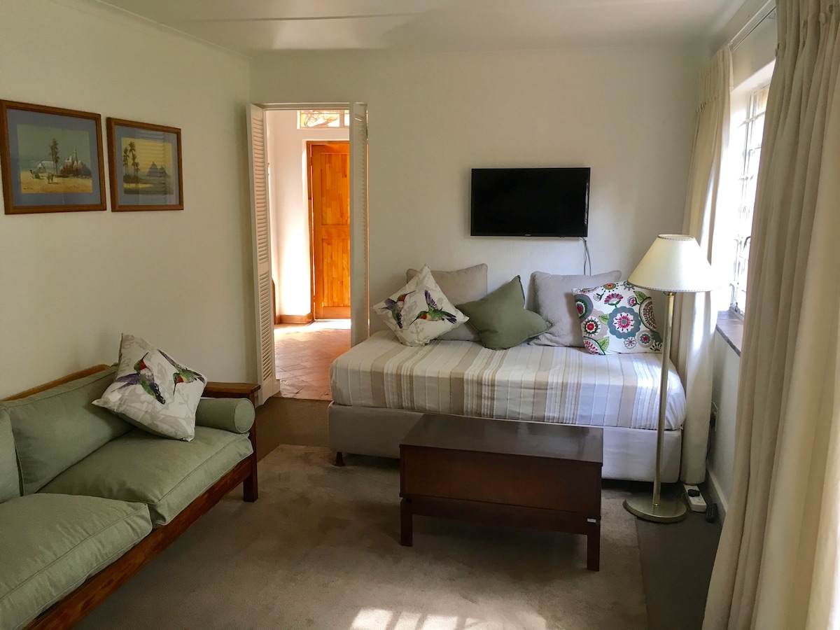 Charming farm house decor in whites and greens. Revamped modern bathroom with shower. Queen size bed plus three quarter bed for extra guest/children. Private garden patio area with table and chairs. Breakfast on request from 7 to 9am. Fiber wifi. Small well trained dogs with their own beds welcome. There is ample parking, security and a swimming pool available. The room is serviced weekly or at your convenience.