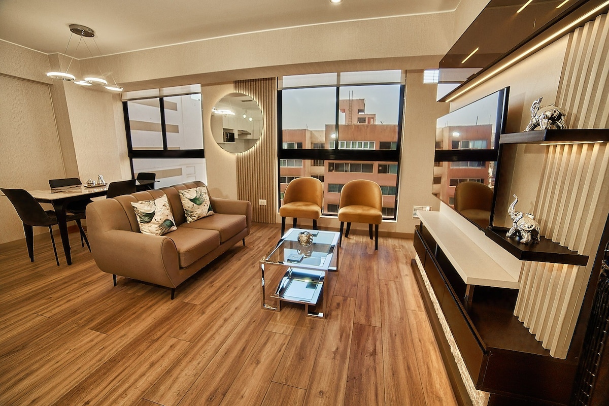 Very practical apartment. Bedrooms furniture is costume made by Kuni Peru with a beautiful wooden plating, very creative and unique. The night stand lamps have usb ports and have perfect lighting for night reading. The living room and bedrooms lead to balconies with views of Miraflores, La Paz St. and Diez Canseco St. and have floor to ceiling canceling sound sliding screens. The couch is American made and is extremely comfortable. 24 hour convenience store literally in front of the building.
