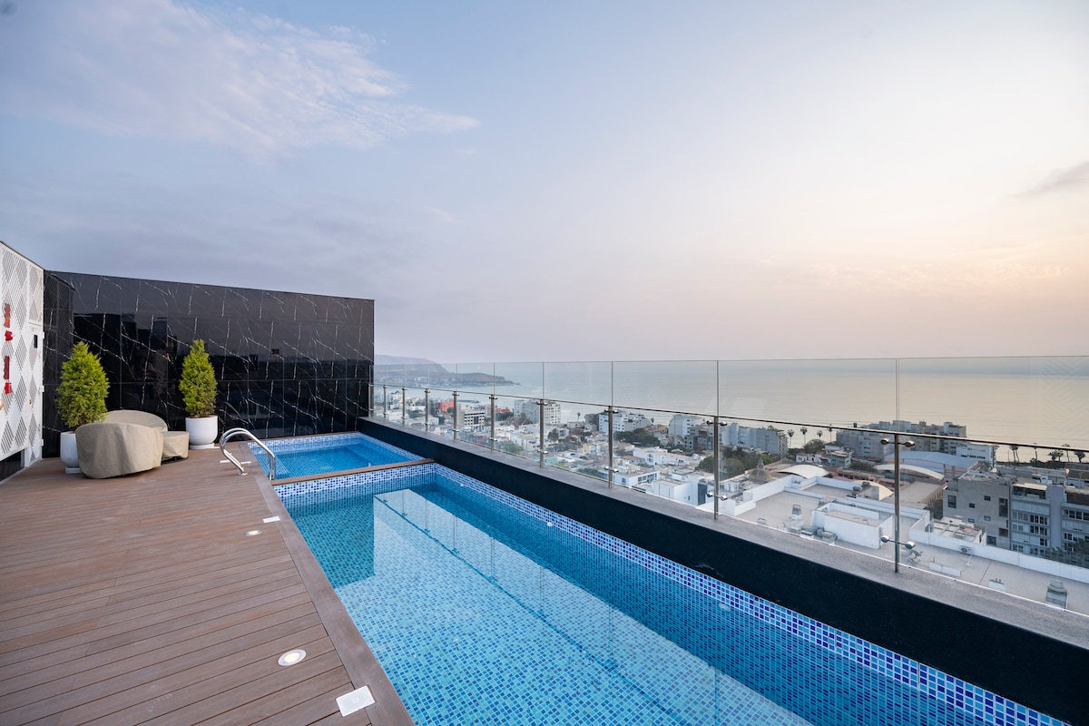 The best place to stay in Barranco. Come and enjoy a quiet space and a district that has the best in tourism, cuisine, museums, and the beach. We are located in front of a park and two blocks from the Malecón with ocean views. If you like to walk or play sports, this place is perfect for you. If you want to do remote work, you will have an incredible time with the 50" TV, terrace and for your moments of rest, spend it in the pool with sea views. Just a few blocks from Miraflores.