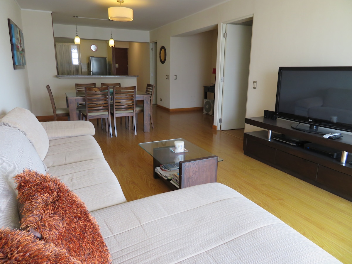 Es un apartamento cómodo, ubicado en el centro de miraflores a 1 cuadra del malecón, muy cerca a restaurantes, centros comerciales (larcomar), lugares turísticos, playas, entre otros. De 90 m2 de amplitud con 1 cama, 1 baño completo y 1 medio baño, 1 cocina, sala y comedor. El apartamento está en un sexto piso con ascensor. Un lugar muy acogedor y en uno de los distritos más importantes de Lima.