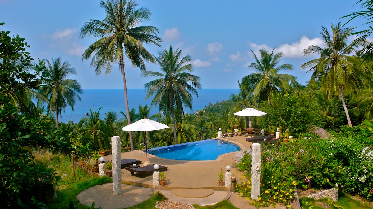 Our tropical villa is a dream come true. It sits perfectly on a steep hillside about 35 meters above sea level with a stunning panoramic sea view on the small secluded island of Koh Tao. You instantly want to relax on the generous wooden deck and enjoy the sunset. Or have a swim in the infinity pool. Or do nothing in particular but enjoy life. Either way, this is simply a beautiful place.