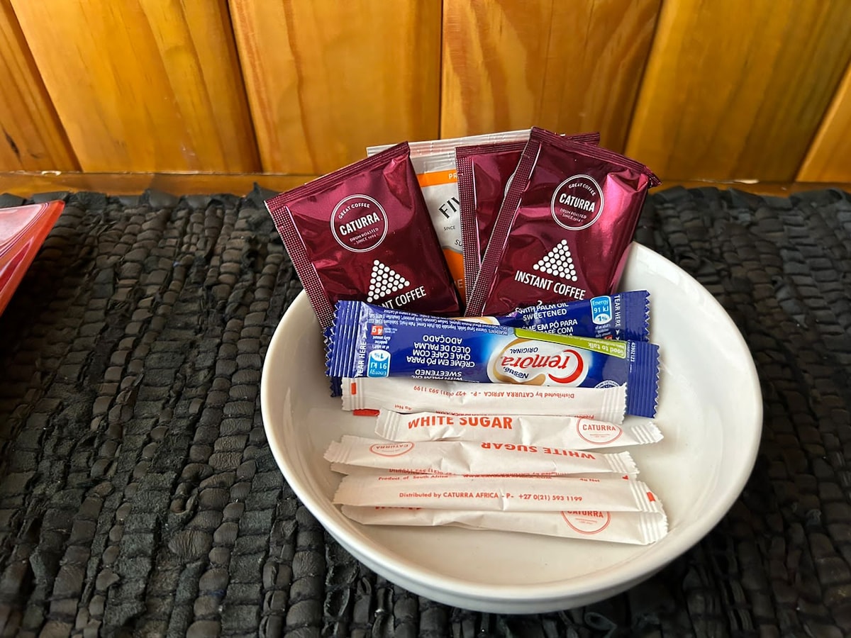 The lounge is equipped with an aircon, flat-screen TV with DSTV and streaming services.
