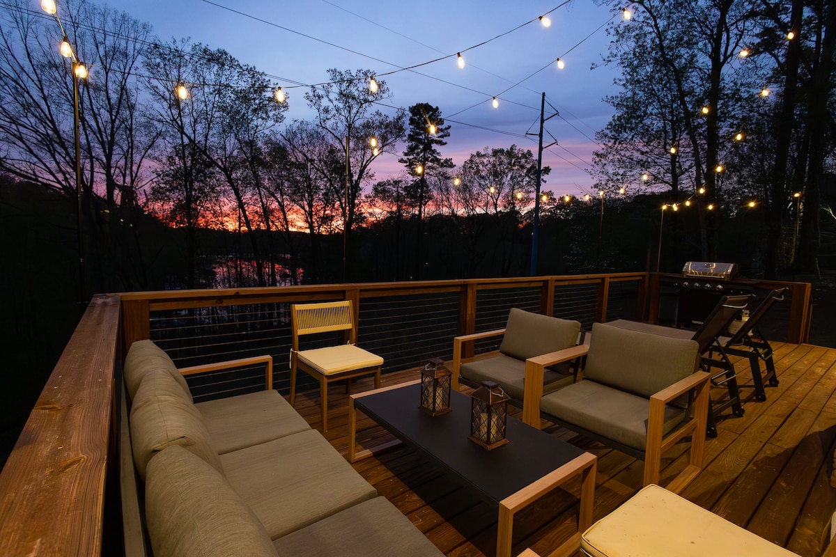 Lake Lanier Islands Retreat - Sleeps 9 Holiday Marina view property with hot tub exactly 1 mile from Lake Lanier Islands Resort and Margaritaville. Take our new 6 seat shuttle to the Resort to visit License to Chill Snow Island or Fins Up Waterpark. Indoor fun with 2 home theaters, a smart tv in every room, Skeeball machine, large collection of modern board games, Xbox and remote gaming, air hockey, and foosball. Ideal for families, wedding parties, and business travelers.