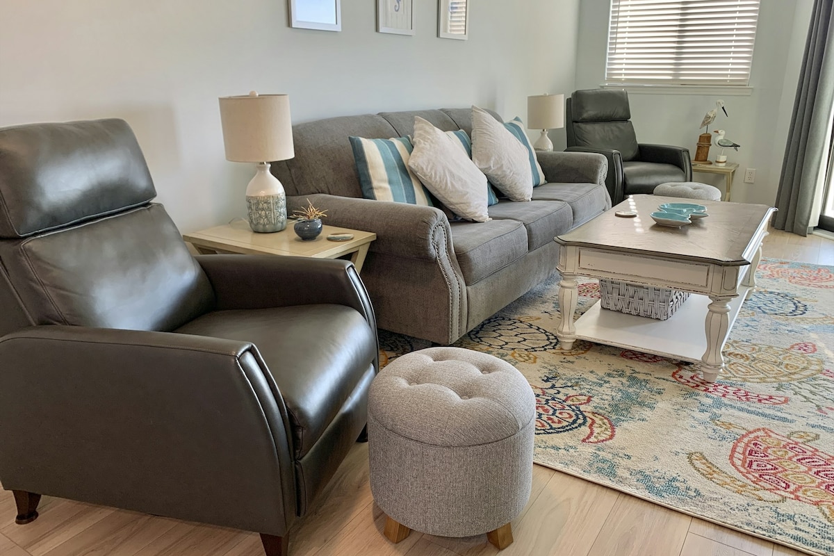 In this gated & private oasis, you're just steps to the wide white sands of this semi-private beach. Thorough cleaning & sanitation in this 1st floor end unit sleeps 4 on real beds, K in bedroom & Q Murphy bed in living area. 2 Full Baths. Smart TVs. Stocked kitchen provides all pots & pans for cooking; basic spices, olive oil, vinegar, plastic wrap & foil. Beach needs all provided; Hair dryers; all detergents, soaps, and paper products stocked. Washer/Dryer. NO PETS OR PARTIES. STR2025-000007