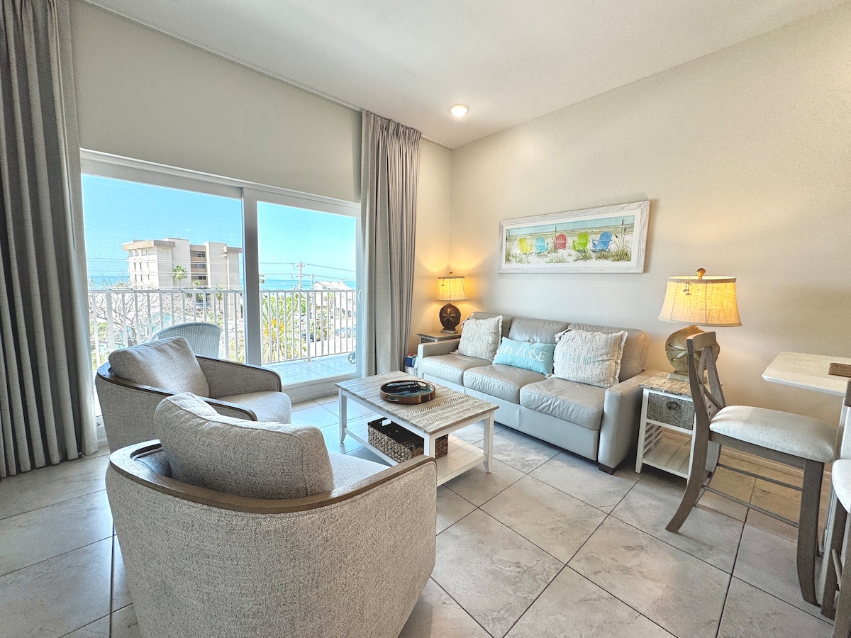 Our condo has spectacular water views from the Bay to the Beach. We have a large one of a kind kitchen that is unique to our resort, with granite counter tops, hardwood cabinets, and all stainless steel appliances. Everything you need to prepare a meal is provided along with basic spices and condiments, Coffee, creamer, and sugar. The master bedroom has a new king size bed and walk in closet with all beach gear also available for your use. We have 2 - 50" flat screen TV's with cable as well.