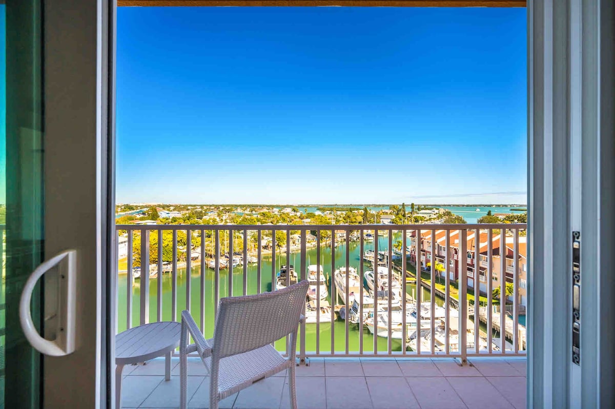 This unit is completely updated and modern! Enjoy a GORGEOUS view from the 20' private balcony overlooking the Bay, pool and hot tub! Watch dolphins every morning while sipping your coffee, or while enjoying a glass of wine in the evening! A 6-minute drive to Madeira Beach, and close to all amenities with many restaurants nearby, including Doc Ford's next door, and shopping within 7 minutes. Lots to do; close to fishing including deep sea, and jet skiing. 1 bedroom, sleeps 4; comfy pull-out.
