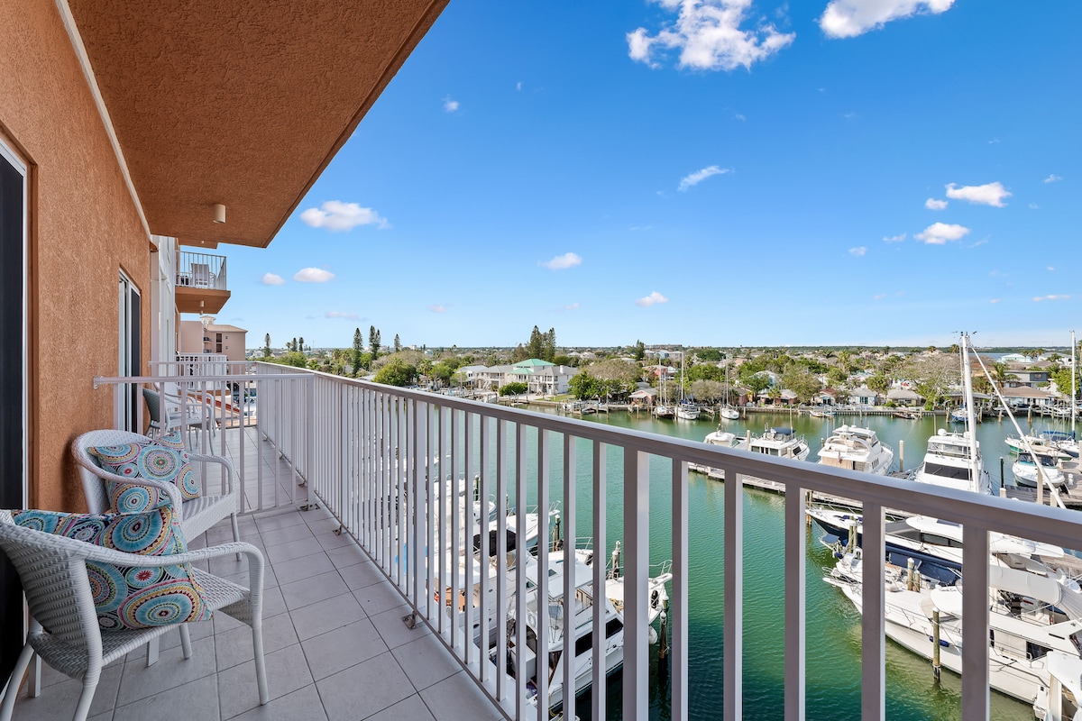 Beautiful , New 3 bedroom Condo - directly across from the Beach . Gorgeous marina views from 2 of the 3 bedrooms . Walk straight to sugar-white sands, enjoy dinner on the patio overlooking boats — perfect for couples, families, or groups. Located next to John's Pass Village (Restaurants and Shops) . The condo features 2 full bathrooms and a pull out sofa and can accommodate up to 8 guests. WIFI , 3 smart TV's in the Unit. Washer/ dryer Free parking for one vehicle onsite