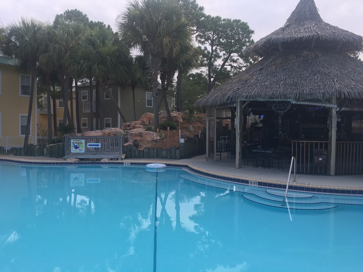 The Salt Shack condo is located within the Purple Parrot Village Resort, which is about 1/2 mile from the white sandy beach of Perdido Key! The UPSTAIRS condo's rear terrace overlooks the outdoor resort style pool/hot tub! This vacation home has a king size bed in the bedroom and set of built-in bunk beds in the living room which allows it to sleep up to 4 guests. Other amenities include a heated indoor pool/hot tub, fitness center and saunas.