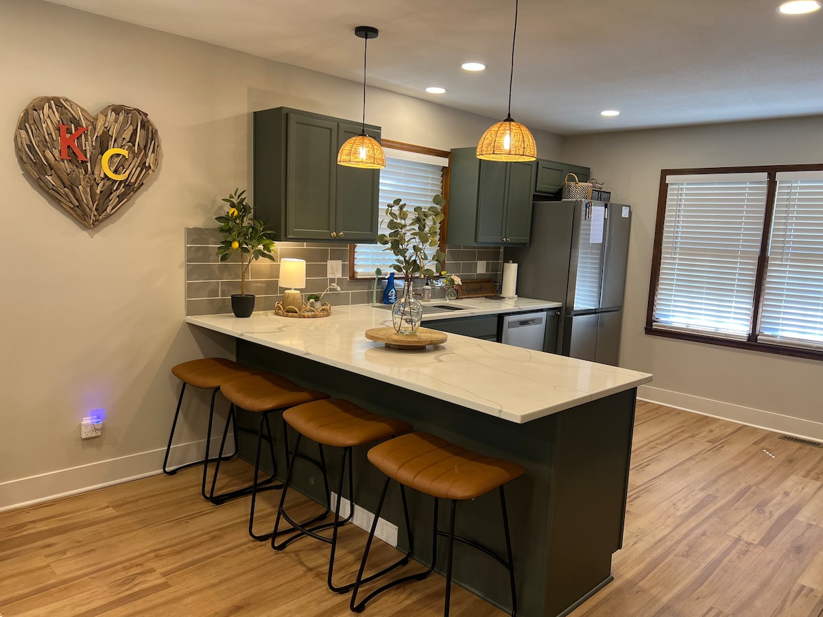 The Hadley cottage is a great place to bring the family for a fun get-a-way or perfect for your work needs. This chic & modern cottage is 3 minutes from I-35 and conveniently located to get you anywhere in the KC metro quickly. This is a quiet neighborhood with wide sidewalks within walking distance to restaurants or shopping. The cottage features a renovated interior in 2022, huge fenced backyard, and a long driveway for ample parking.