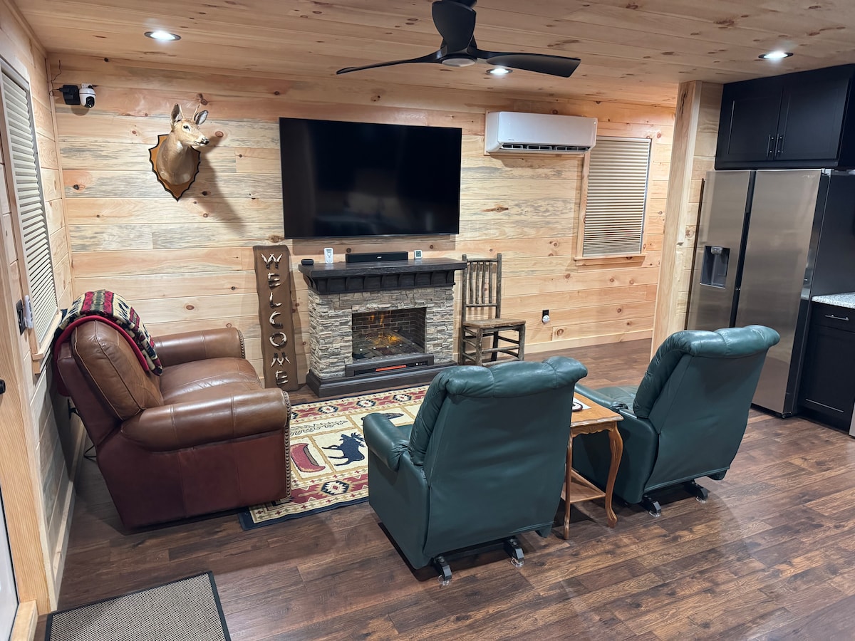 This is our second cabin built by hand. It has a kitchen with a stove, mini fridge, microwave and coffee pot. It also has basic cooking necessities. The cabin has a full size bed. The restroom has a sink and stand up shower. We will provide towels and linens. Despite the listing saying 2 beds, it is in fact, 1 double bed. Sorry for the listing mistake. We allow pets, but ask for prior knowledge. We are just minutes from 2 separate trailheads to the Appalachian Trail.