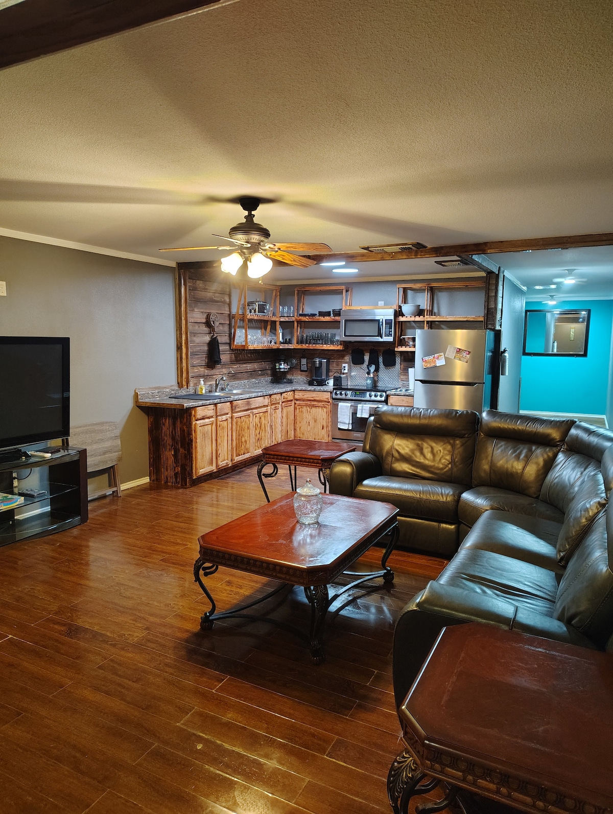 Kick back and relax in this calm, newly remodeled space surrounded by acres of beautiful oak trees. Enjoy the backyard oasis and take a dip in the pool or relax in the hot tub. You can also enjoy a nice BBQ in the outdoor cabana furnished with a Blackstone grill, full-size refrigerator and outdoor TV. It's also the perfect place to enjoy a peaceful bookcation or stay in and binge-watch all your favorite movies and shows. This slice of heaven is the perfect quiet getaway to relax and unwind.