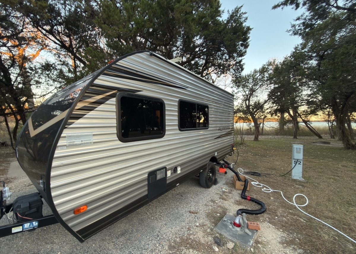 Welcome to Aura, our Forest River Aurora RV, designed for a comfortable, stress-free camping experience at Cleburne State Park. Aurora is delivered and fully set up by the host — including leveling and hookups — so you can simply arrive and enjoy. There’s no towing, no setup, and no driving required. Important: This RV is stationary during your stay. Guests do not tow or drive the RV at any time. **Camp site reserved separately **** 30amp site okay!