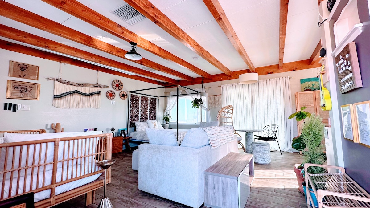 Unwind in a vintage 1961 desert cabin where mid-century charm meets epic Mojave views. Set on 25 acres beside untouched BLM land, enjoy sunrise coffee, Milky Way nights, and serene desert silence. Inside, original retro details blend with modern comfort. Minutes from Joshua Tree, hiking, sound baths, dining, and live music at Pappy & Harriet’s. Your peaceful desert escape is ready—come make lasting Mojave memories. Enjoy your stay! SB County rental permit: CESTRP-2020-00387