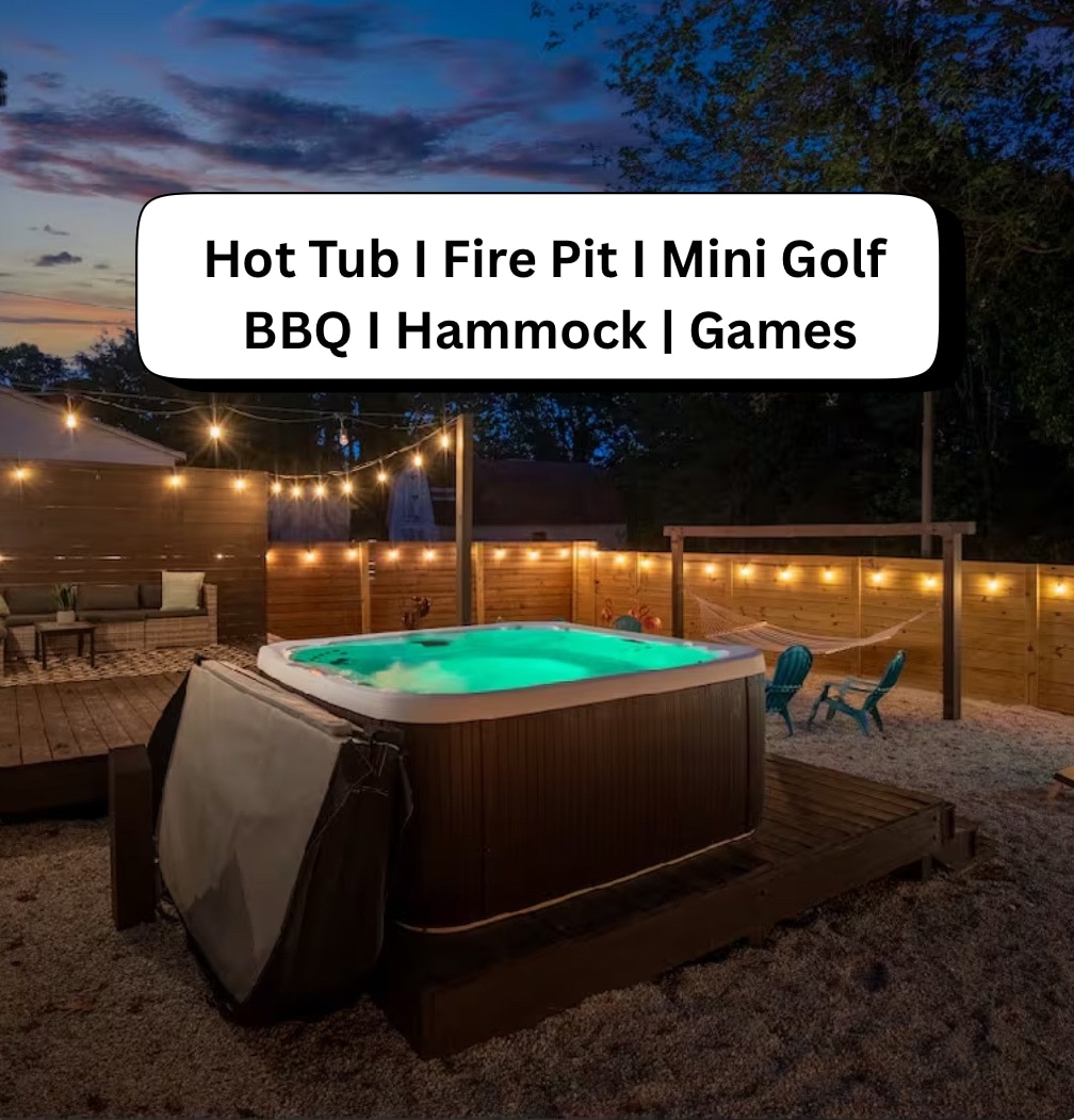 Your backyard oasis! Enjoy a fully fenced yard with hot tub, mini golf, a custom deck with privacy wall, fire pit, hammock, cornhole, life-size Connect 4, and giant Jenga, perfect for an unforgettable Raleigh getaway with family or friends. Just 5 mins from downtown, Red Hat Amphitheater, Walnut Creek, and Duke Energy Center, and 10 mins from NC State. Fun, comfort, and convenience all in one!