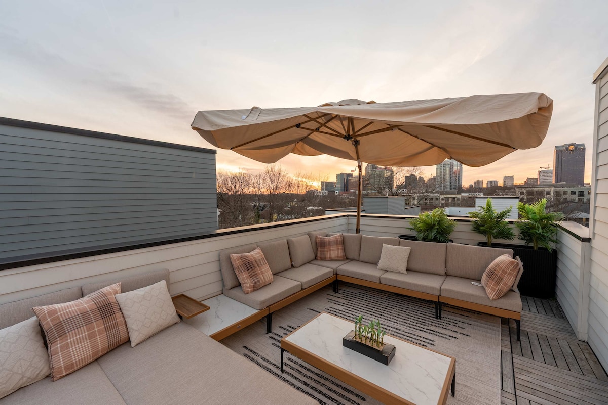 This stunning 3BR/3.5BA townhome in downtown Raleigh offers high-end comfort, space, and style for 6 guests. Enjoy a private rooftop terrace with 2 fire pits, grill, and city views. Each bedroom has its own ensuite bath, and the open-concept living area features a chef’s kitchen, gas fireplace, and Smart TV. With garage parking, an elevator, and walkable access to Red Hat Amphitheater, restaurants, and breweries, this is the perfect stay for business trips, family getaways, or concert weekends.