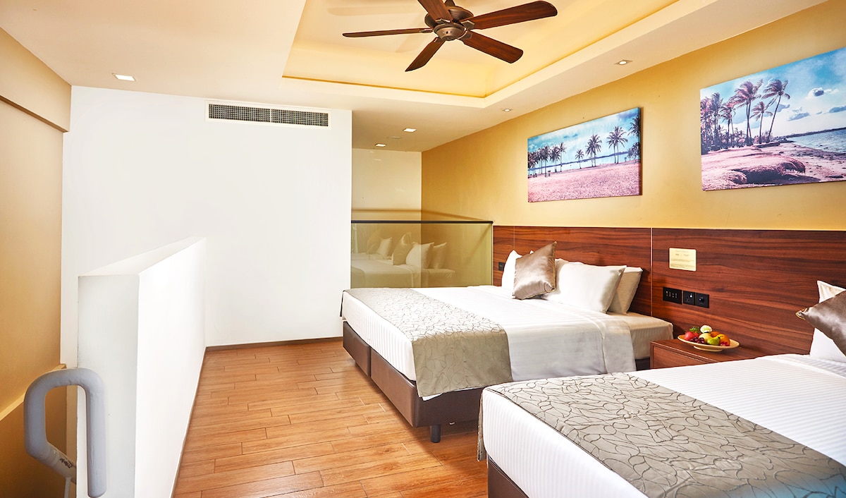 Two-storey Beach Loft Crash in the class you deserve! Enjoy a thrilling, entertaining, delightful, and leisurely time on the grounds, and a chilled beach experience when you stay at this one of a kind, attractions, beach resort! 3 Adults / 2 Adults + 1 Child Located on the 3rd floor, this two-storey room comes with 1 Queen-sized bed, 1 single bed, a patio, and a kitchenette. Did anyone say "beach!"? It's only a few minutes walk away!