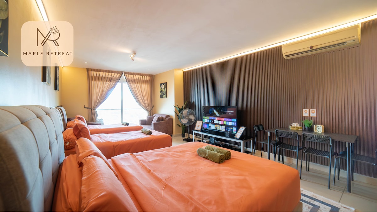 This is a spacious 2Bedroom unit perfectly fit for guests up to 5 pax with total of 1 king size bed 1 queen size bed 1 single bed High floor with high view. 1. Basketball Court 1. Gym Room 2. Function Hall 3. Lounge 4. Library 5. Manicure Shop 6. Mini Theatre 7. BBQ Deck 8. Swimming Pool 9. Sauna 10. Jacuzzi 11. Game room (Pool Table, PS Room, Darts and more) 12. Laundry 13. Mini Market -Sky Garden Guest are not allow to smoke in the room , please smoke at the balcony if needed