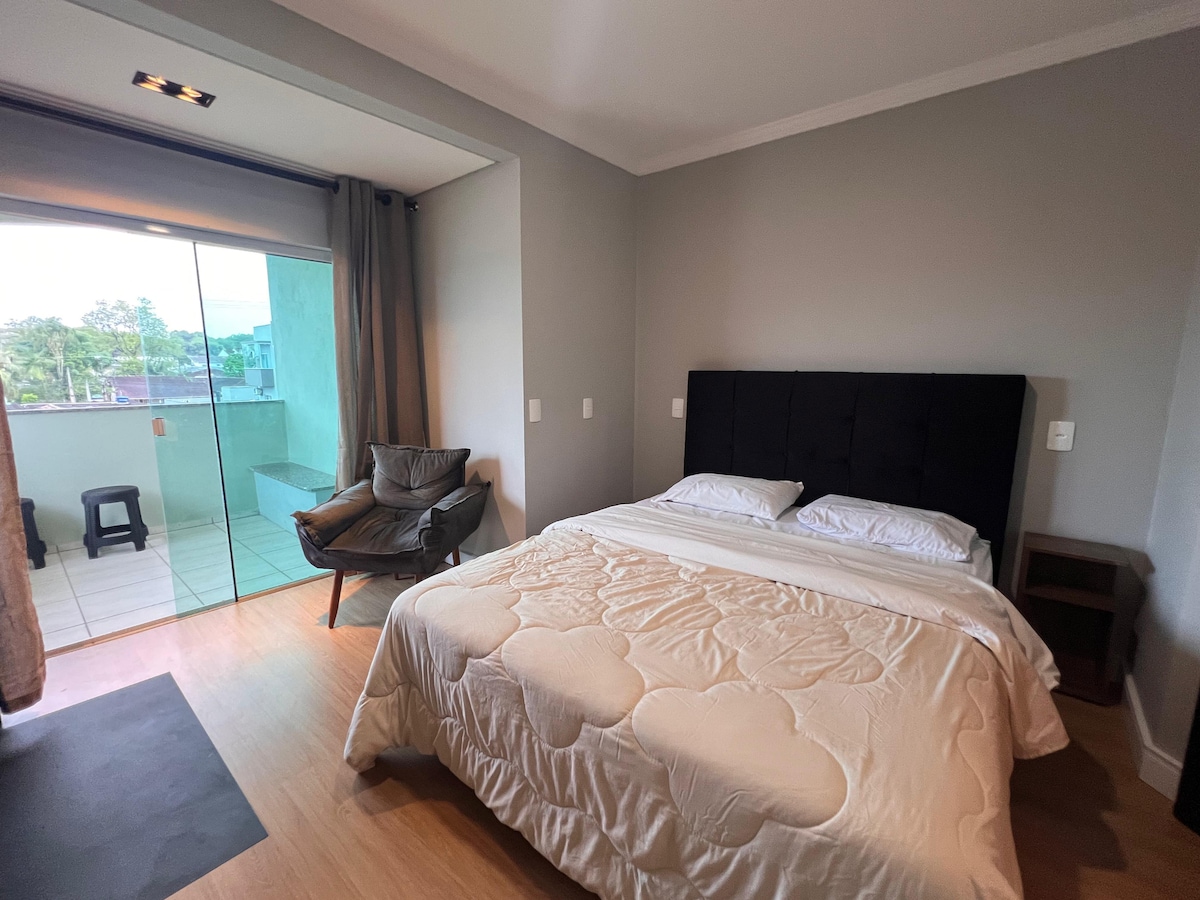 Espaço prático e aconchegante com todos itens básicos de cozinha , 2 TVs uma na sala e outra no quarto com vários canais e aplicativos. Próximo ao Mercado Municipal , Catedral de Joinville , Rua das Palmeiras, comércios , bancos , bem no coração da cidade. Lugar silencioso e agradável, com garagem própria . Um lugar de fácil acesso para vc se locomover a pé sem se preocupar com o transito. obs : tem vaga de garagem própria, mas pra carro pequeno