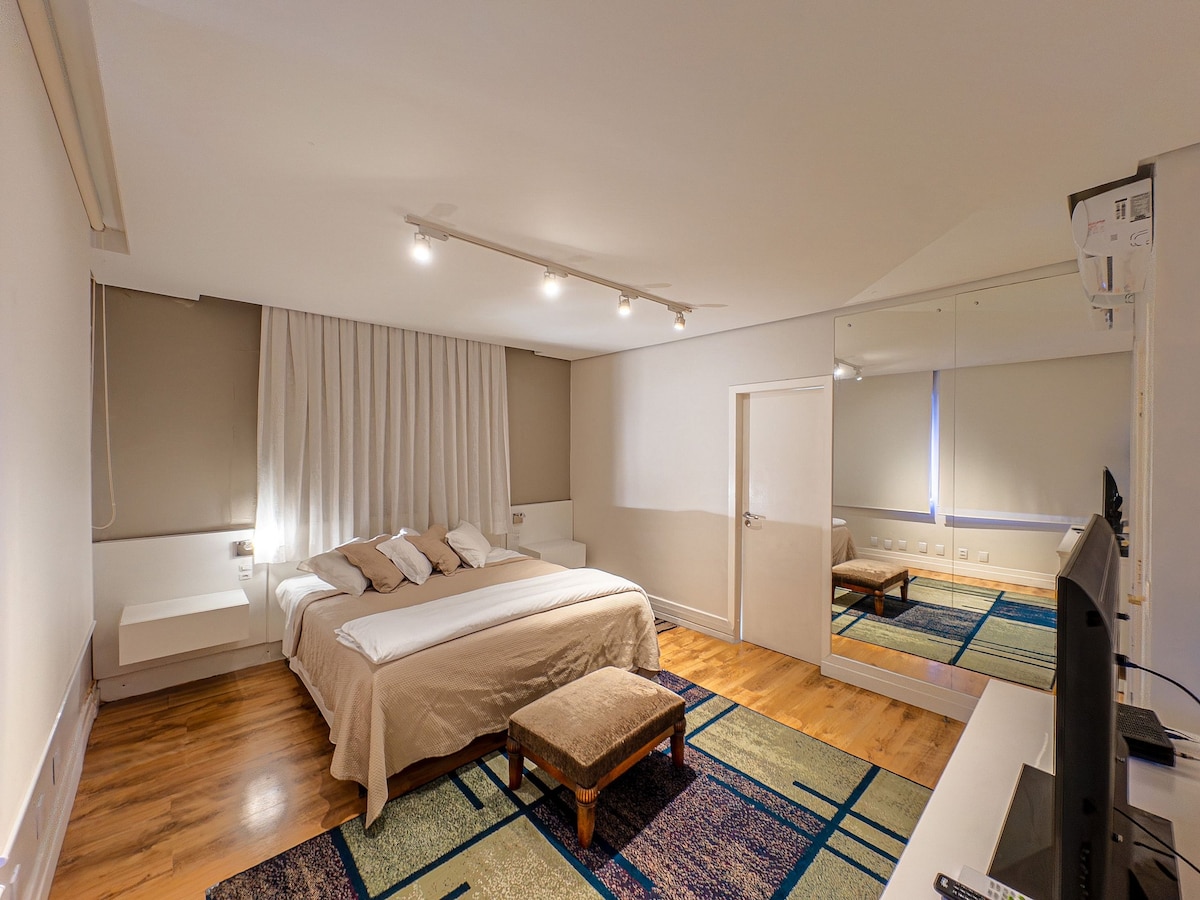 As fotos falam por si! Pra quem busca estilo, conforto e sossego. Apartamento com 01 dormitório, bem equipado e decorado. Prédio residencial com poucos moradores em rua calma e tranquila. Sistema self check in/out, permite comodidade e liberdade de horário para os hóspedes. Sejam bem vindos!