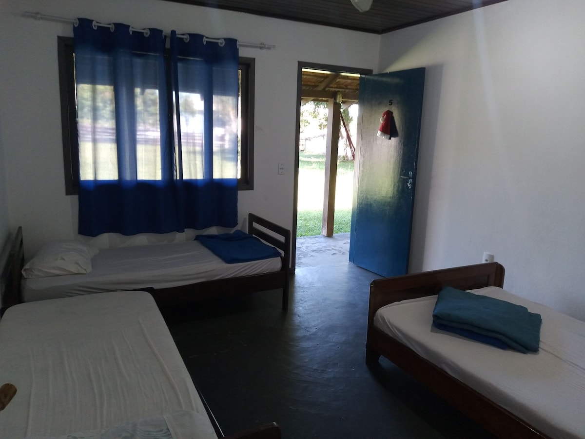 O quarto fica no Piso Térreo com TV a cabo, wi-fi, ventilador de mesa e cama de solteiro. Este quarto dispõe de duas camas de solteiro.