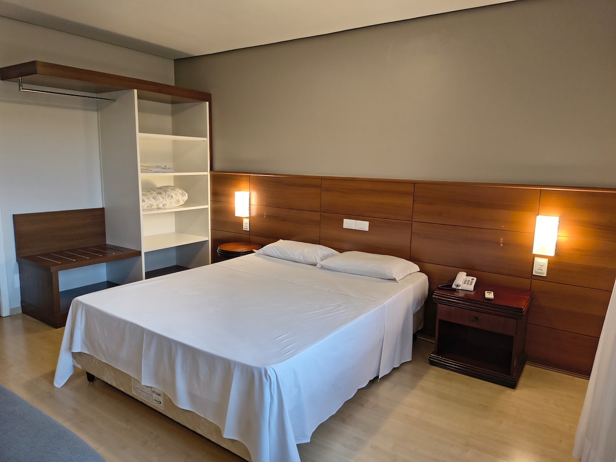 Café da manhã, Wifi, carregador de carro elétrico cortesia na hospedagem Taxa de turismo: R$ 3,00/diária ISS 3% incluso Diária por pet R$129,00 Estacionamento - R$ 30 por dia Quarto com decoração moderna equipado com: Ar condicionado quente e frio SmartTV led 32” Telefone Frigobar Caixa de som bluetooth JBL Camas box solteiro Espelho de corpo inteiro Ampla janela com blackout duplo Enxoval de primeira linha Ducha com aquecimento central Ducha higiênica Secador Amenities biodegradáveis