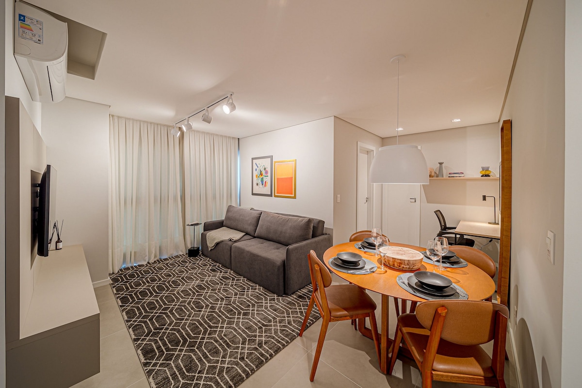 Abrace a o aconchego neste lugar tranquilo e bem-localizado. Um apartamento aconchegante, com tudo que você precisa para tornar sua experiência ainda mais agradável. Totalmente mobiliado e com estrutura em um prédio pensado para o conforto. Edifício com horta, bar, mercado, bicicleta, garagem, academia, rooftop com piscina e salao de festas. Ambiente perfeito para passeio ou trabalho. Venha viver a experiência em nossas propriedades.