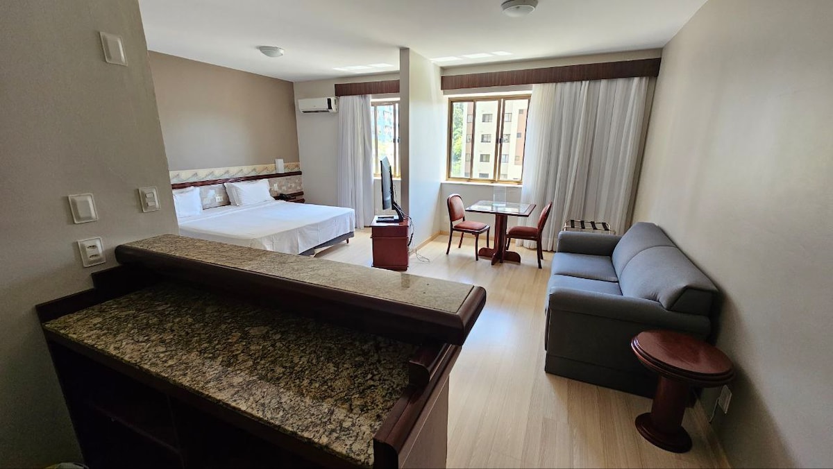 Enjoy a great location. Excellent restaurants near by. Queen bed with pillow top for more comfort Daily cleaning Smart TV Fast WiFi Basic kitchen tools Kettle Sandwich maker Cooktop Smart TV Fast WiFi 24hs hotel reception Swimming pool Gym Sauna The staff are super kind and polite. You will absolutely enjoy!
