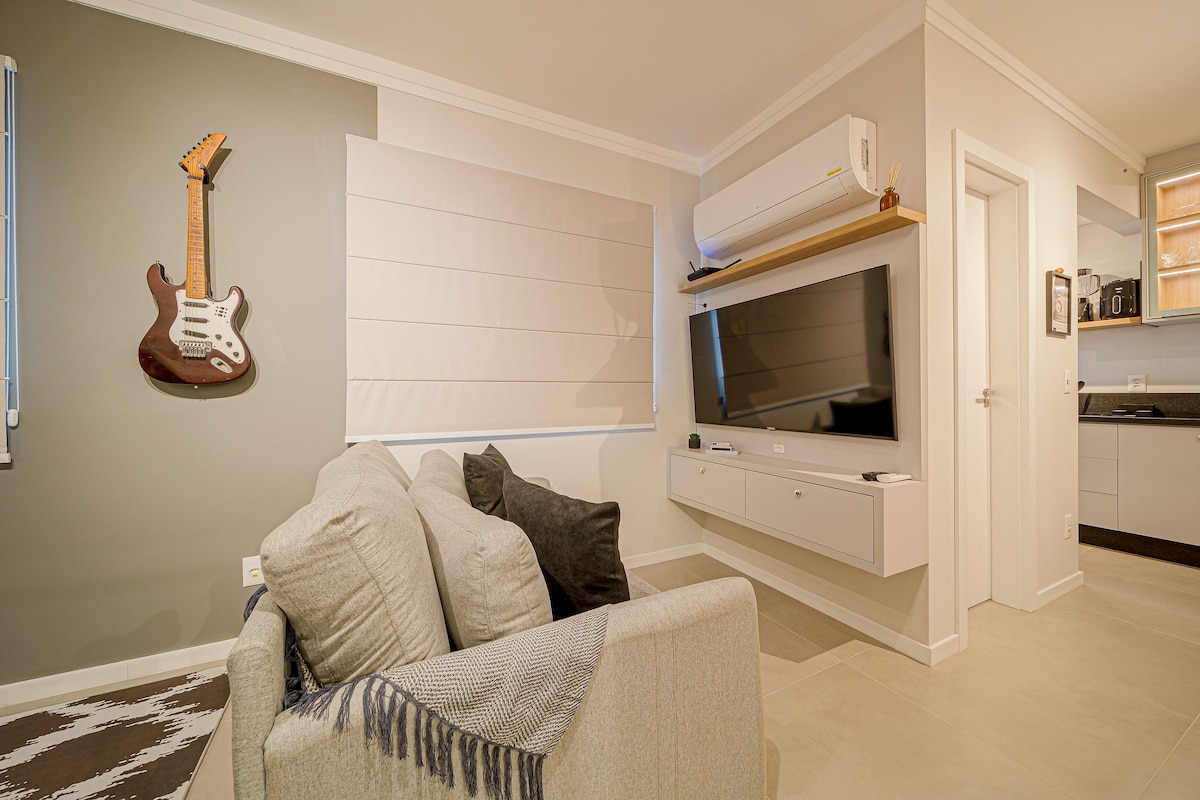 Apartamento de 40m, um quarto e uma vaga de garagem coberta. Hospede-se conosco e desfrute de uma vista incrível para a Serra e uma piscina no rooftop. O apartamento é novo, conta com móveis planejados e eletrodomésticos novos e modernos. Roupas de cama e toalhas das melhores marcas, limpeza impecável. Planejamos tudo pensando em hospedar você! O prédio está localizado na região central da cidade de Joinville, a 4min do Festival de Dança, 13min do Aeroporto, 8min até o Garten Shopping.