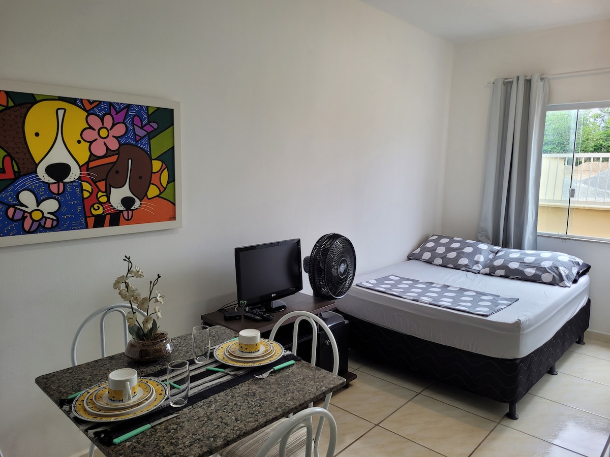 O Studio possui cozinha e quarto integrado, sacada e banheiro. Andar alto com elevador. Uma vaga de garagem. Próximo a rodoviária. Possui uma cama de casal Queen (colchão magnético), com opção de + 1 colchão de solteiro no chão (com cobrança de taxa extra p/ o 3°hospede). *Para que a reserva seja efetivada é necessário informar o nome de todos os hóspedes. O congelador pode não estar disponível, pois utilizamos o apto quando não há reservas. NÃO ACEITAMOS RESERVAS DESTINADAS A ENCONTROS!