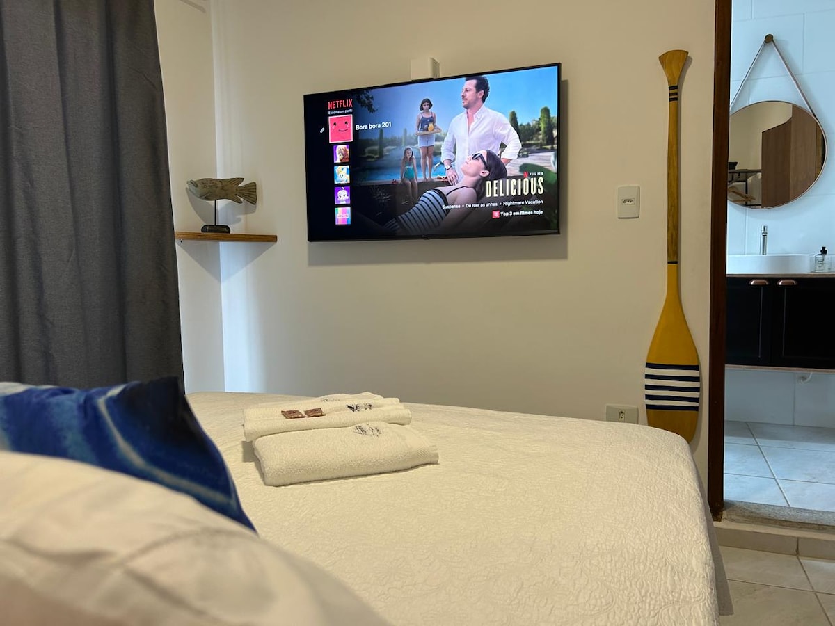 Estiloso Studio temático tipo Suf Lifestyle! Super refinado, confortável e luxuoso, ideal para pessoas com estilo buscando conforto e praticidade. Cama Queen linha Benvenutti, super confortável. TV Smart 43" com streaming. Wi-fi potente. Cozinha completa equipara com panelas e utensílios Tramontina, pratos Porto Brasil, copos e taças de vinho. Cafeteira e liquidificador. Fornecemos café em pó, açúcar e sal, além de sabonetes e xampú. Materiais de limpeza também serão fornecidos.