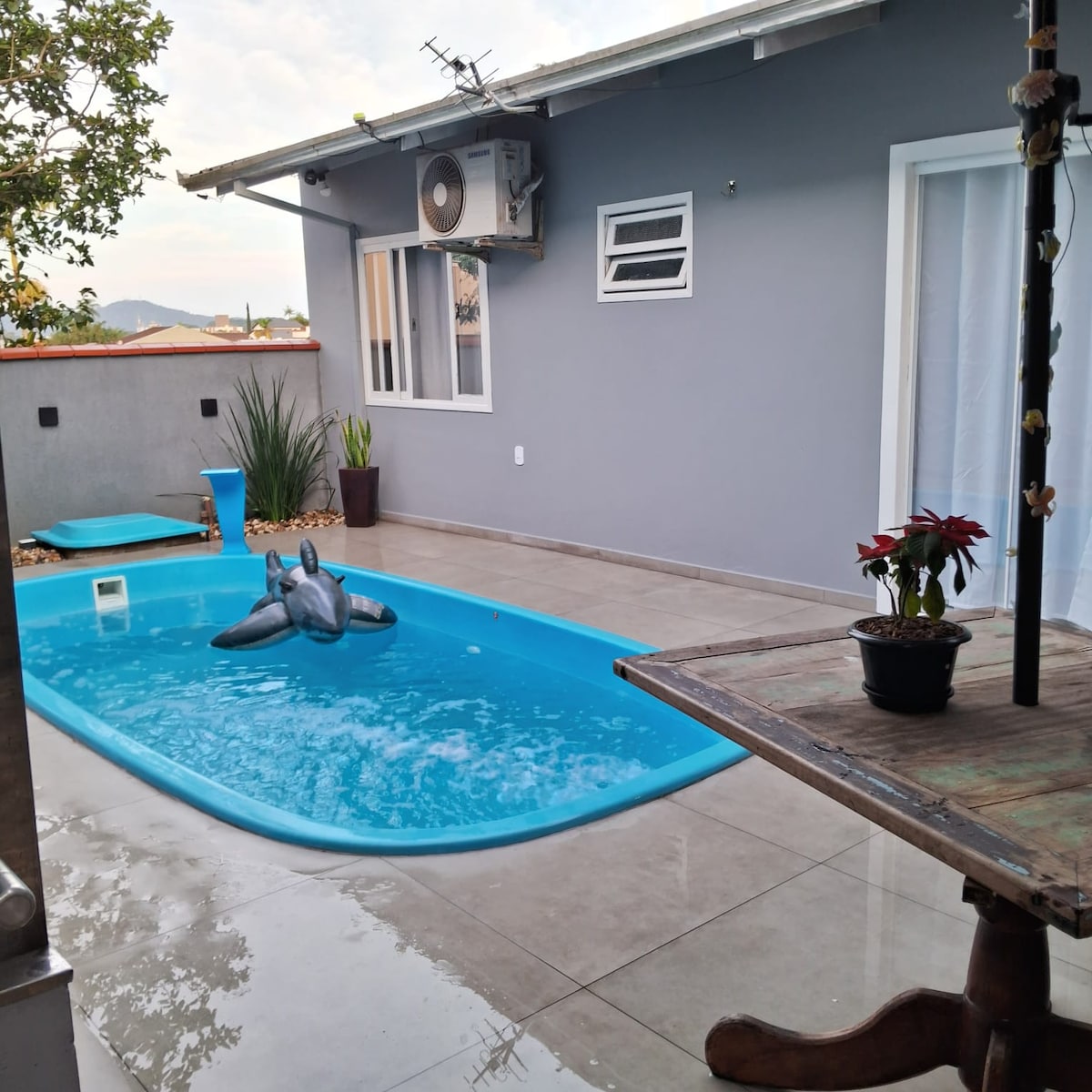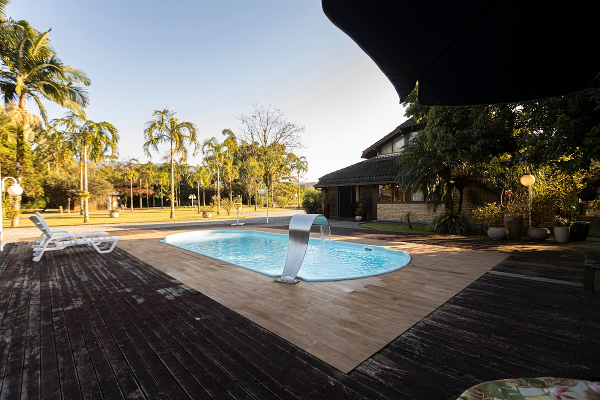 A 15 min de Joinville, casa de campo para famílias e grupos de até 8 pessoas. Jardim amplo, piscina com cascata, lago para pesca, sauna, churrasqueira com forno a lenha e projetor — tudo no mesmo espaço. Três quartos climatizados (1 suíte king), cozinha equipada e roupa de cama de qualidade. À noite, o terreno tem iluminação especial, céu aberto e vagalumes. Próximo a cachoeiras e paraísos naturais de SC. A 2h de Curitiba e 30 min do aeroporto de Joinville. Ideal para descanso o ano todo.