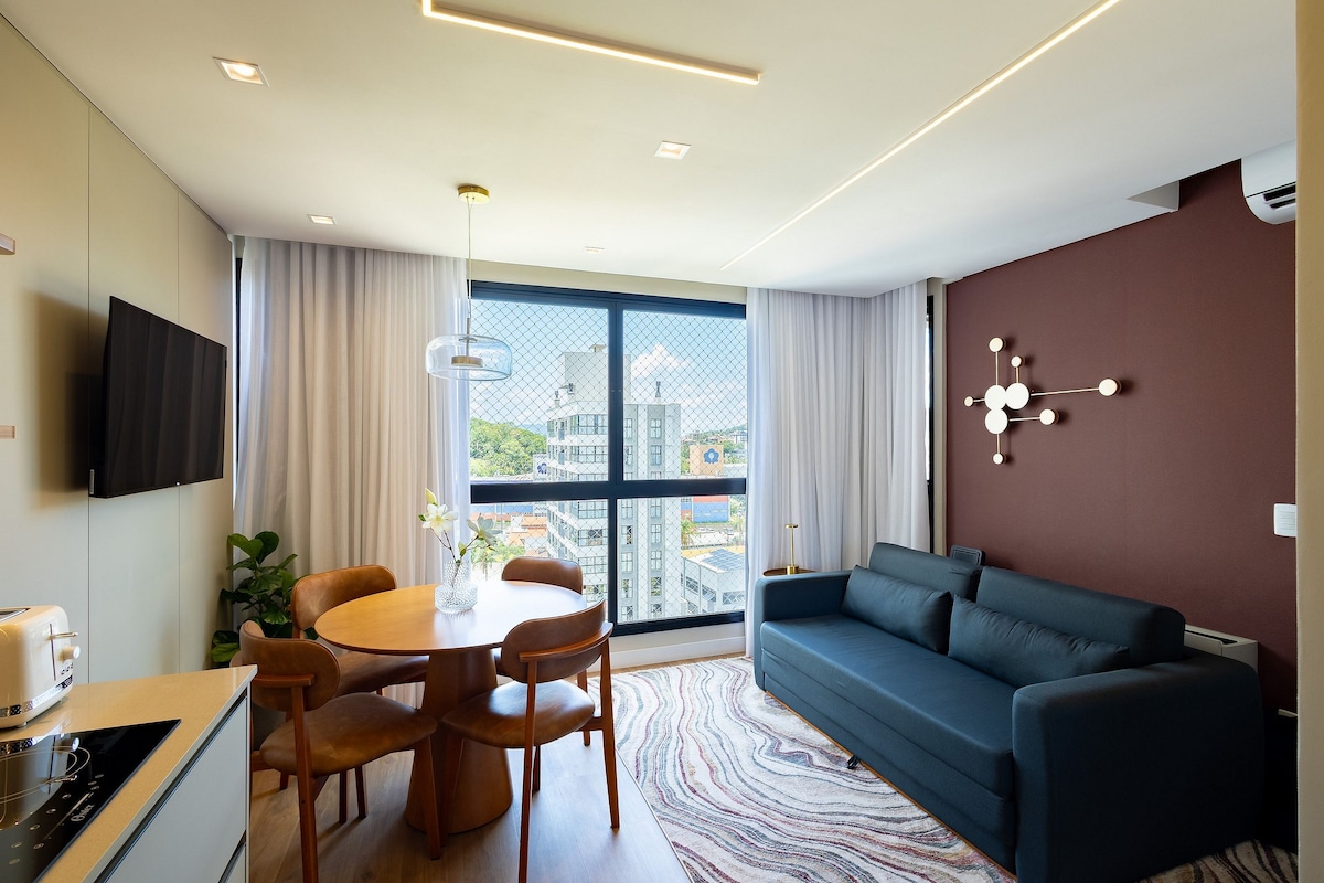 Apartamento de 40m, um quarto e uma vaga de garagem coberta. Hospede-se conosco e desfrute de uma vista incrível para a Serra e uma piscina no rooftop. O apartamento é novo, conta com móveis planejados e eletrodomésticos novos e modernos. Roupas de cama e toalhas das melhores marcas, limpeza impecável. Planejamos tudo pensando em hospedar você! O prédio está localizado na região central da cidade de Joinville, a 4min do Festival de Dança, 13min do Aeroporto, 8min até o Garten Shopping.