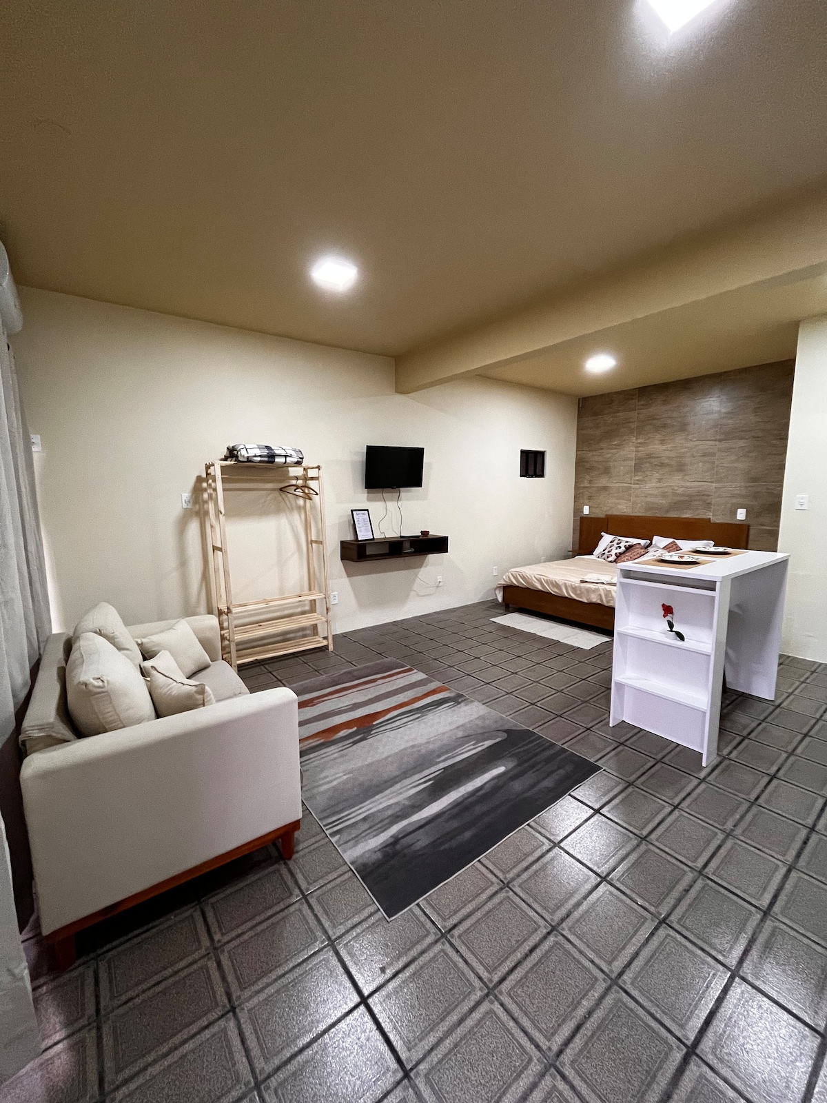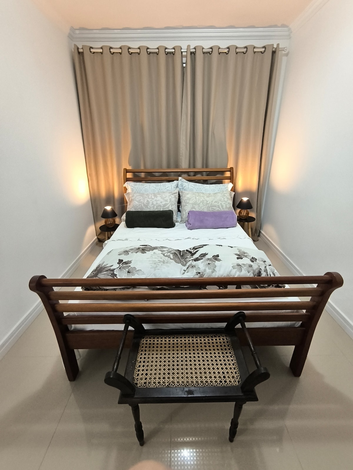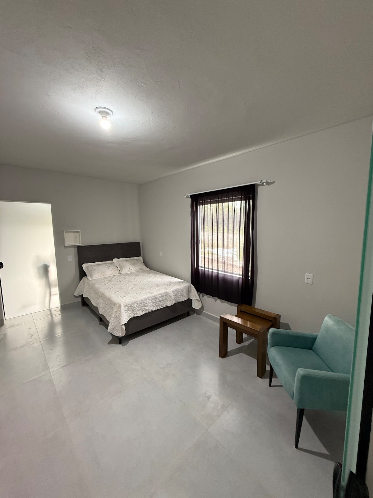 Ótima suíte completa no piso superior, com cama de casal, lavabo exclusivo para uso dos hóspedes. Acomoda duas pessoas. Os hóspedes têm acesso a suíte e à área de lazer, incluindo churrasqueira com pia e fogão, uma rede para descanso, sofá, mesa e lavabo. Ficam disponíveis também louças para a comodidade dos hóspedes caso queiram utilizar na área de lazer. A lavanderia também fica disponível na parte inferior do imóvel caso haja necessidade.