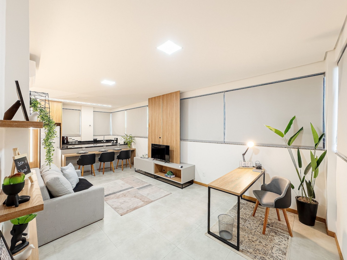 Apto em andar alto, no Centro de Joinville c/ 1 suíte com cama queen + 1 sofá cama + lavabo. Churrasqueira na sacada. Smart TV e Wi-Fi. 100 mts da Via Gastronômica e do Shopping Mueller. 01 Km do Centreventos Cau Hansen. Cozinha com fogão de indução, microondas, air fryer oven, cafeteira Nespresso, chaleira elétrica e utensílios. Lavanderia coletiva disponível no prédio c/ custo adicional. Prédio ainda dispõe de piscina, academia*, cinema* e sala reunião*. *conf. disponibilidade agenda*