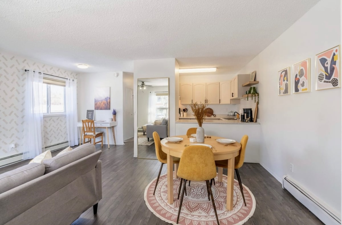 Plum's Place is a charming one-bedroom home, perfect for couples, solo travellers, or those visiting for work. Backing onto green space and trails, it offers stunning aurora views. Enjoy a peaceful stay with all the comforts of home, surrounded by nature yet close to everything you need. There are two black dogs on the premises. While they are upstairs and separate from the suite, some occasional barking may be heard. We recommend this stay is best suited for guests without pet allergies.