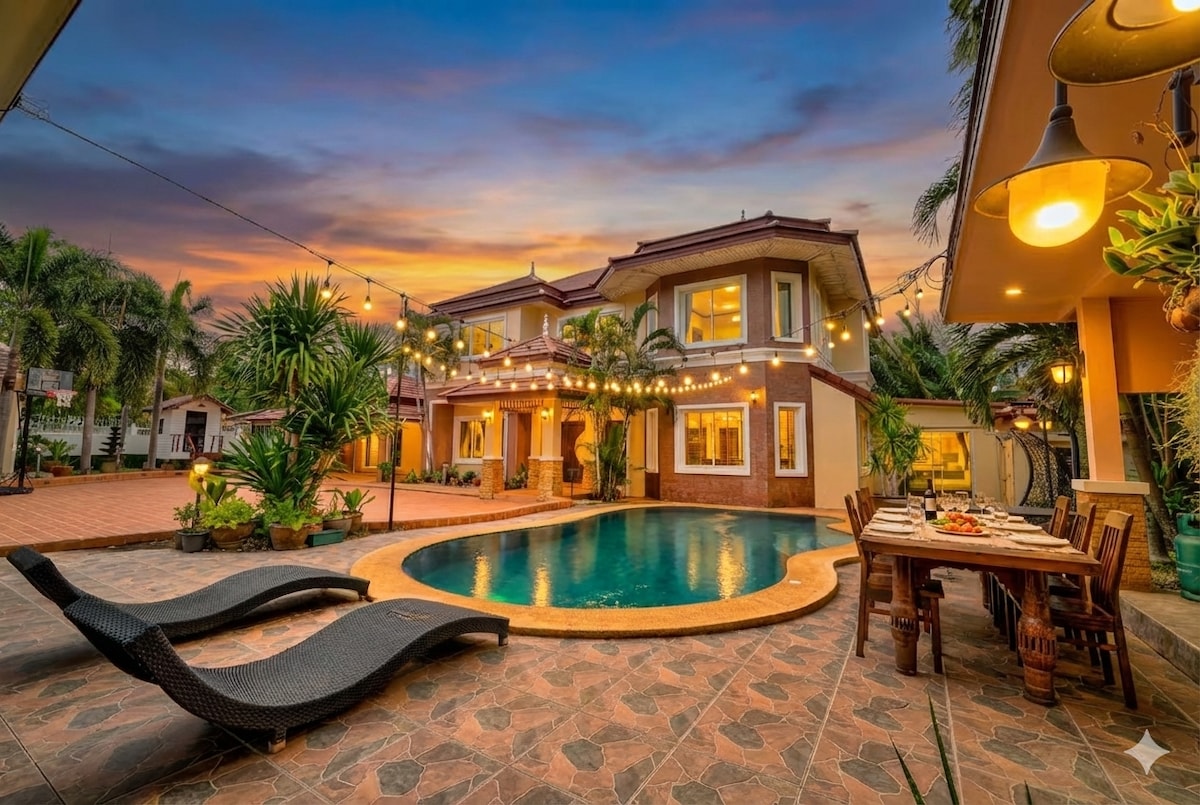 🎉限时优惠: 入住满3晚得3%折扣+早餐折扣价100泰铢/位; 入住满7晚得5%折扣+早餐折扣价100泰铢/位; 🚘交通服务:满3晚送1000泰铢的接送机折扣,满5晚送2000泰铢接送机折扣; 💗设施和服务:美式早餐150泰铢/位,卡拉OK点歌机,烧烤设备、包车,SPA按摩,泳池漂浮下午茶、客房清洁、火锅、海鲜、烧烤的烹饪设备、协助食材采购配餐(厨师预定服务额外收费); 💒「房源介绍」: 美丽的别墅位于芭堤雅市怀亚区(HuayYai),距离素坤逸路300米(Sukhumvit Road),距离中天海滩行车10分钟(Jomtien beach),是占地800平米的单层独栋建筑,房间面积500平方,拥有11间卧室,2间独立的客厅、2个餐厅用餐区、2间厨房; 庭院面积200平,有45平米私人泳池,50平米的草地花园,有专门设计的户外用餐区;可以举办户外泳池派对(无安静时段限制),免费提供卡拉OK和影音设备; 🏪[安享生活] 社区安保24小时巡逻,门口有711和Lotus生鲜便利店24小时营业、以及中国餐馆/本地餐馆/夜市;日常出行会帮助预定出租车;
