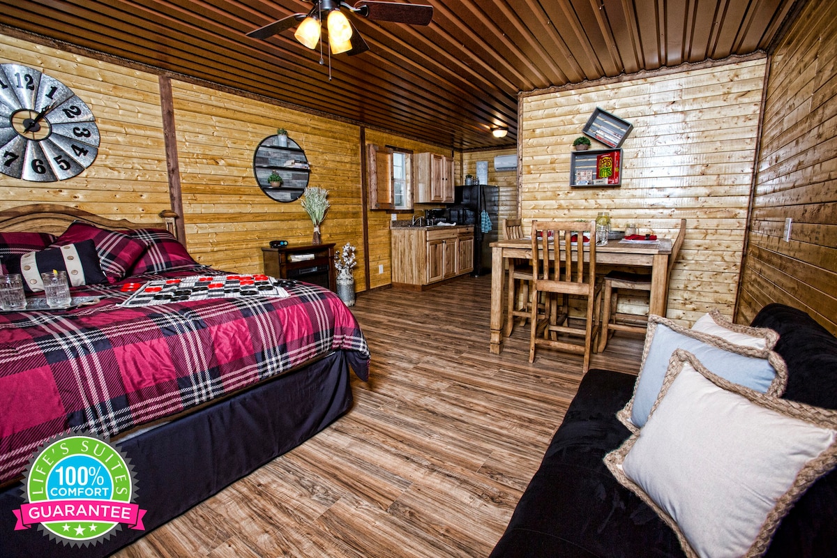 Relax & unplug at this countryside couples retreat! Enjoy the peace & privacy this gorgeous 1 bedroom barndominium has to offer. Featuring a fireplace & jetted bathtub in the living room. The shower room boasts a waterfall shower head & window with prairie views. The kitchen is fully equipped, just bring the food to fix! And the bedroom offers a comfy queen size bed. Enjoy the sunset from the patio, then snuggle under the stars! Book now & bring your honey to this dreamy little love nest!