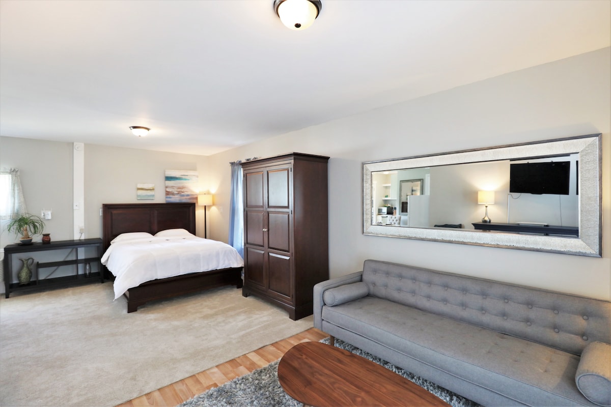 A full walkout basement with lots of lighting! In the bedroom it can get dark enough for you to sleep in or you can let the sun shine through the blinds. There's one bedroom, one bathroom with a Jacuzzi (not an outside hot tub), a mini kitchen (no stove) big living room with big screen TV! Private entrance. Cozy and comfortable! You can retreat and feel renewed! Due to the coronavirus, we’re taking extra steps to clean and sanitize frequently touched surfaces between reservations.