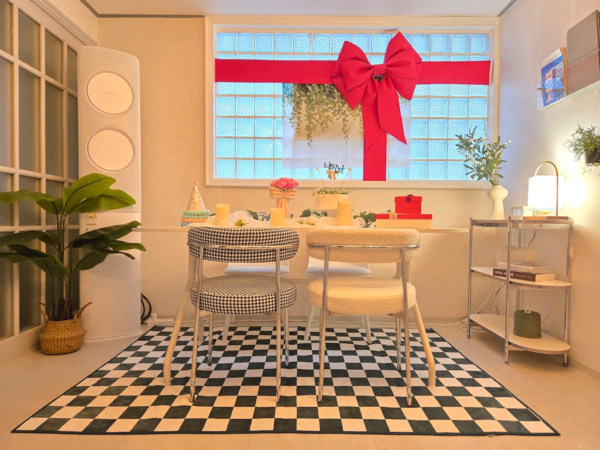 🎅🏻크리스마스 세팅완료🤶🏻🦌~1월까지 🌸홍대입구역 중심부에 위치🌸 📞24시간 빠른응답의 호스트 🚇홍대입구역 2번출구 4분 320m 🌿연남동, 경의선숲길 2분 150m 🧺빨래방: 4분 280m 🛏️퀸 사이즈 침대 3개 🎥빔프로젝트 🛡️현관문 3중 안전장치 🗺️명동 20분, 경복궁 20분, 서울타워 40분, DDP 15분 🚶♂️편의시설 🏪편의점 도보 30초 💄올리브영 도보 1분 🛅짐보관소💱화폐교환📱유심 도보 3분 🎁웰컴어메니티🎁 게스트님의 행복한 여행을 위해 제 소중한 마음을 담았습니다 ! 제공되는 먹거리(쿠키, 김, 커피, 차 등)는 무료입니다. 한국의 '情' 문화🤲❤️🔥 🙋♂️Hi 호스트 Jun 입니다 ! 홍대입구역에 도착 후 도보 약 3분 소요됩니다. 또한 숙소는 1.5층(평지로부터 낮은 계단 6칸)에 위치하여 쉽게 체크인 할 수 있습니다🏡 게스트님이 제 집 & 제 가치관과 좋은 인연이 되었으면 좋겠습니다🤝