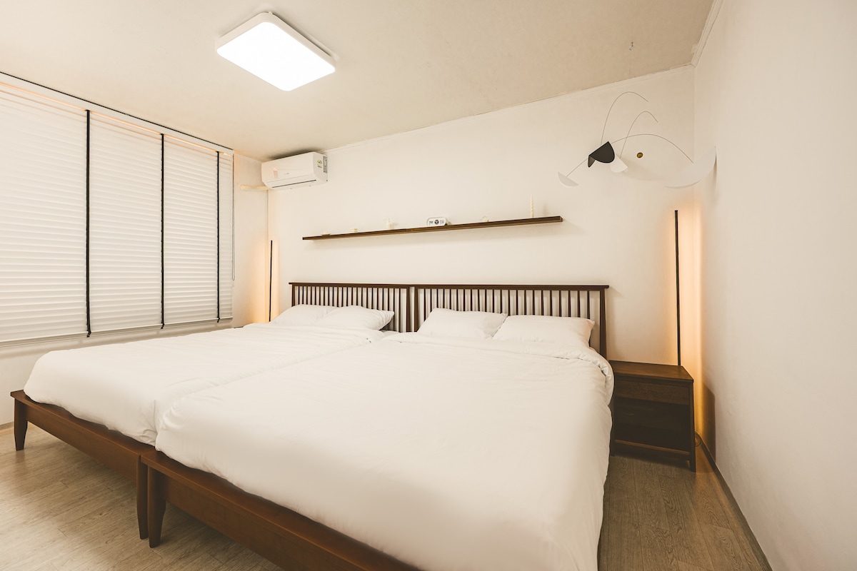 도심속의 한강변 조용한 숙소에서 편안한 시간을 보내세요. 합정역, YG 엔터테인먼트, 망원시장 근처에 위치해 이동이 편리하고, 주택가 안쪽에 자리해 도심의 소음에서 벗어나 조용하게 머물 수 있는 공간입니다. 넉넉한 3개의 룸과 3 개의 퀸사이즈 침대, 호텔식 침구류가 완비되어 있어 가족, 친구들과 함께 편안한 휴식을 취하기에 안성맞춤입니다. 깔끔하고 따뜻한 인테리어, 여유 있는 거실과 넓은 식탁, 취사가 가능한 주방까지, 마치 내 집처럼 편안한 시간을 보내실 수 있도록 준비해 두었어요. 🚌 교통 공항버스 6002번 합정역 정류장: 도보 10분 합정역 2,6호선 8번출구: 도보 10분 마을버스 16번 새 서울의원 하차: 도보 3분 🏪 주변 시설 24시 편의점: 도보 2분(간단한 생필품, 스낵을 팔아요) 24시 코인세탁소: 도보 5분(여행 중 빨래 가능해요) 디저트 카페: 도보 1분(달콤한 티라미수와 커피가 있어요) 홈플러스 마트: 도보 1분(여행 마트 쇼핑은 필수)