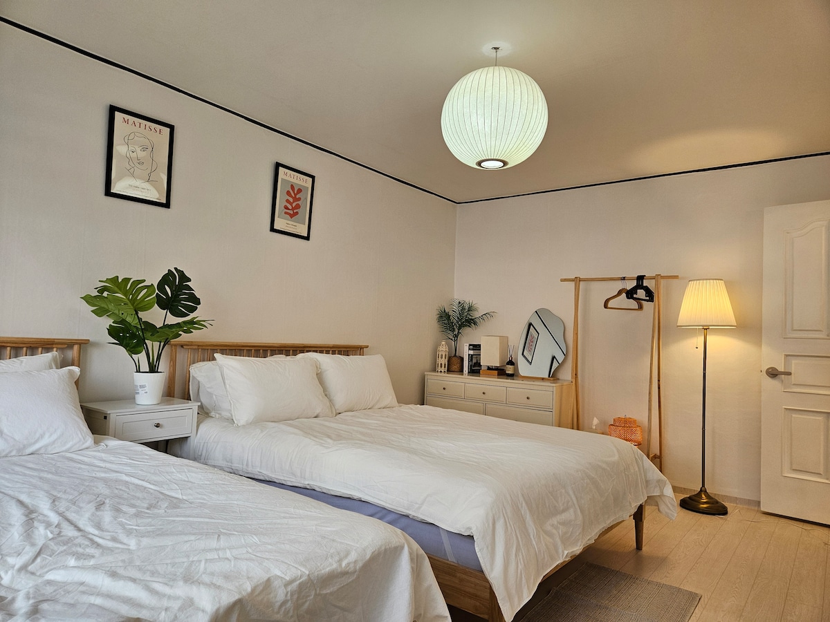 🌿 죽마재 竹庭齋 – 대나무가 심어진 마당과 한옥 서울 한복판에서 한옥 감성과 모던 편안함을 동시에 느낄 수 있는 프라이빗 단독주택 스테이입니다. 외관은 전통 한옥의 고즈넉한 멋을 간직했고, 내부는 세련된 현대식 인테리어로 꾸며져 있어 전통의 품격과 현대의 편리함을 모두 누리실 수 있습니다. 🏡 숙소 하이라이트 1 대나무가 있는 단독 프라이빗 정원 6인용 파라솔 야외테이블 세트 구비 및 야외용 전기바베큐 그릴 사용가능 2 남향 + 대형 창문 모든 방에 큰 창이 있어 자연광이 가득합니다. 3 최대 8명 숙박 가능 (싱글 1개 + 퀸 3개) 4 넷플릭스·유튜브 시청 가능 (개인 계정 로그인 필요) 5 서울 대표 관광지와 가까운 위치 🚇 명동, 종로, 광화문, 경복궁, 서촌, 인사동, 남대문 등 까지 대중교통으로 약 15~25분 소요 6 공항버스 정류장 인근 ✈ 공항버스 6002번을 타고 신설동 정류장에서 하차하면 숙소까지 도보 이동 가능