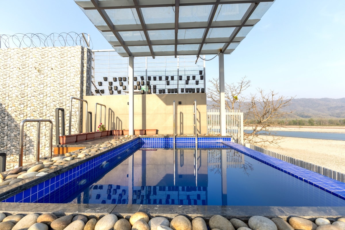 Gangajal Retreat is a serene luxury hideaway near Marine Drive, Rishikesh, offering a breathtaking 360° river view that surrounds you with the divine presence of the Ganga. The retreat features a private pool overlooking the river, perfect for peaceful mornings and relaxing evenings. Guests enjoy a complimentary VIP Ganga Aarti, creating a deeply spiritual experience. The tariff includes all meals, freshly prepared with care, allowing you to relax completely. Ideal for families, couples