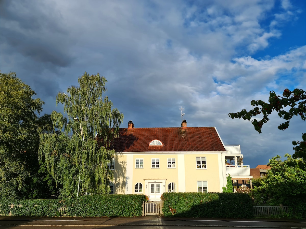 Vi bor på en udde med vatten runt om oss. Över vårt dubbelgarage har vi en lägenhet med alla bekvämligheter. Har tillgång till egen brygga med bad. Finns fina cykelvägar, och strövområden i skog och i närområdet. Skogar med svamp och bär. Det mesta av dina behov såsom flera livsmedelsbutiker (ICA, COOP och LIDL), apotek, systembolag och pizzerior finns inom ca 2 km radie. Bra busskommunikationer till centrum. Ca 1 km till busshållplats. Nära golfklubbar. Några restauranger inom ca 2 km radie.