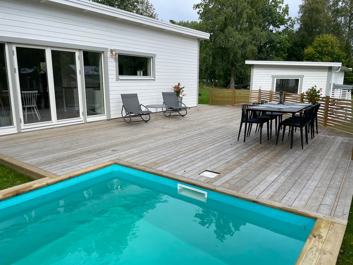 Vårt fina boende ligger beläget ca 10 min med bil intill en större stad Jönköping . Ca 15 min cykel väg till en av Sveriges största sjöar , Vättern . De finns en stor pool på den härliga altanen som är uppvärmd april-september