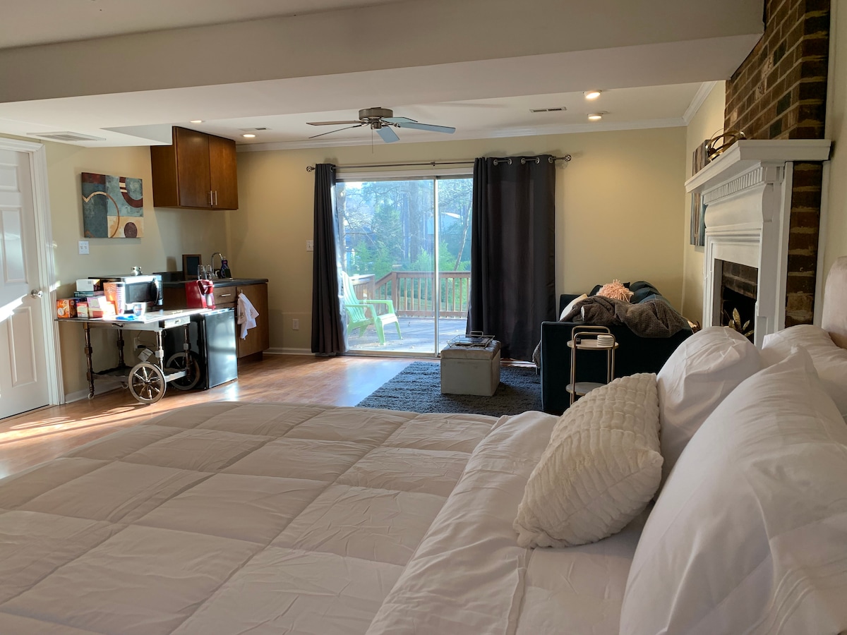 Enjoy a comfortable stay in our safe, clean, private studio apartment. You'll have a garden view of our creek and wooded jogging trails. You can enjoy work productivity or privacy and relaxation in this allergy safe, non-smoking home. 17 min to RDU Airport: 10 miles to Downtown. 11 miles from Falls Lake State Recreation Area. No locals please! We prefer guests who are tourists, visiting relatives, or here on business. No pets or service animals.
