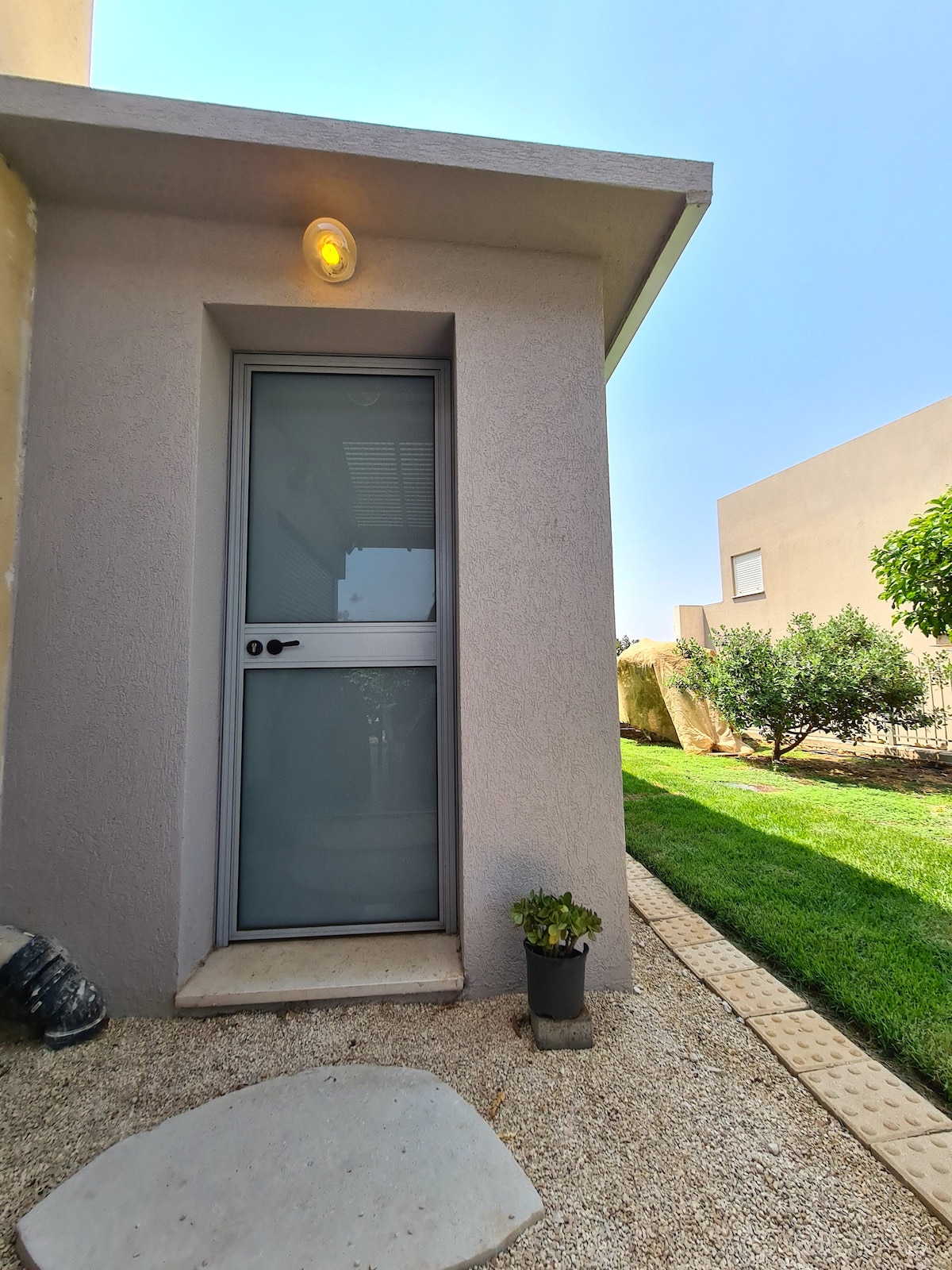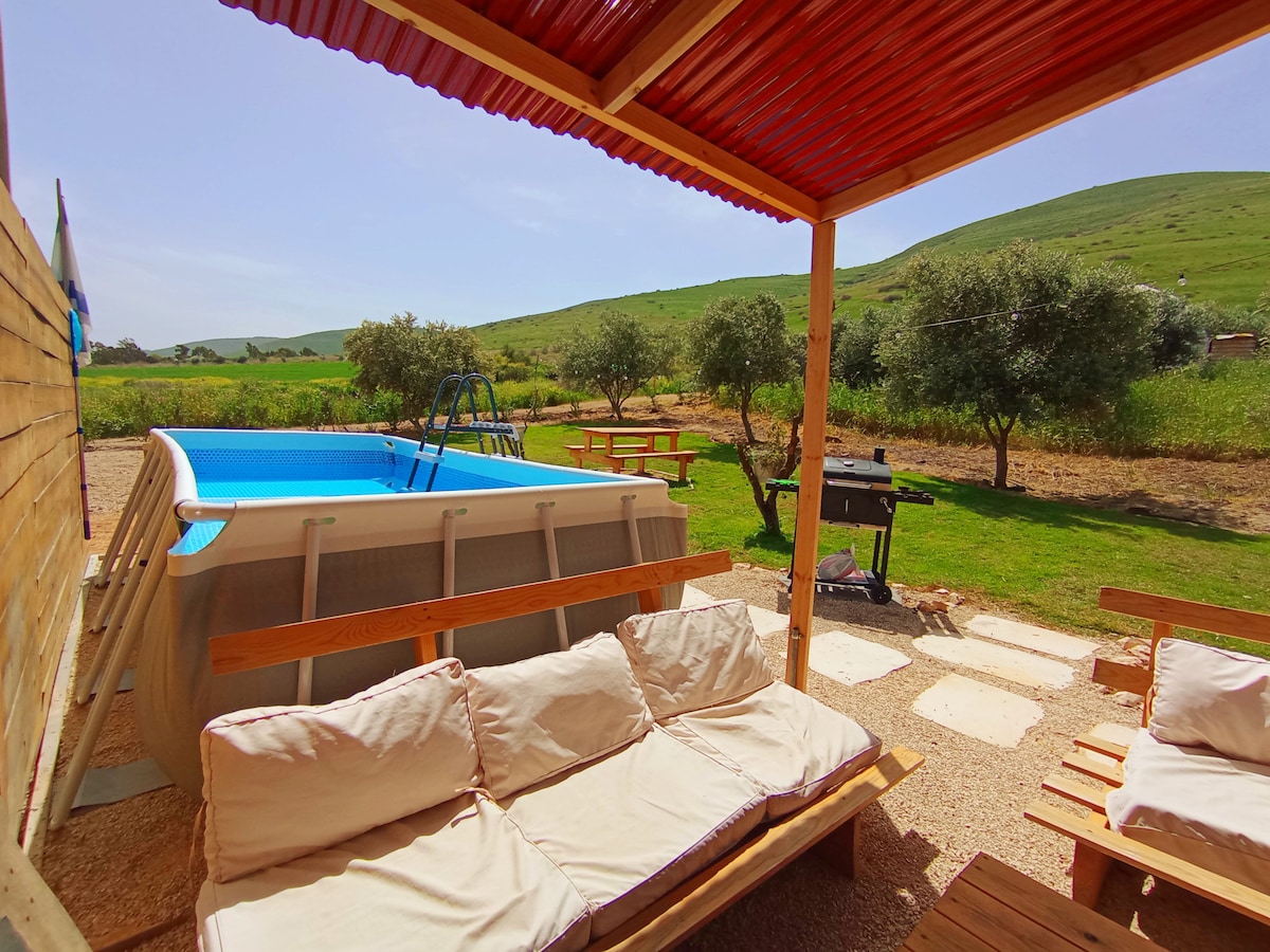 A geodesic dome located in an olive grove at the foot of the mountain in a private and quiet area. The house is wide, spacious, modern and special. There are strong ACs, a fully equipped kitchen, espresso machine, microwave, washing machine, an outdoor seating area with a BBQ, and a pool. The surrounding area is beautiful with natural springs and hiking trails. The Sea of Galilee is only a 10-minute drive away. This house was hand-built by us with love&care. We are happy to share it with you!